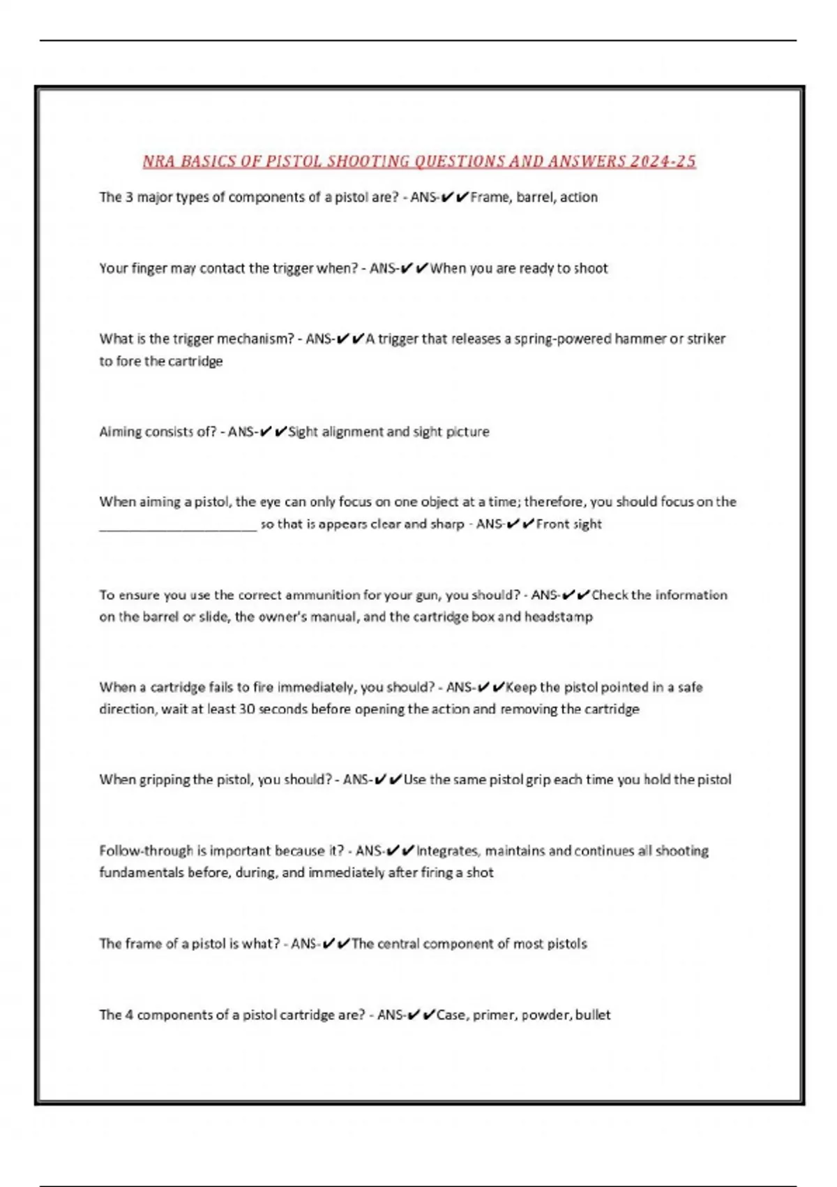 NRA BASICS OF PISTOL SHOOTING QUESTIONS AND ANSWERS 2024-25 The 3 major types of components of a pistol are? - ANS-Frame, barrel, action Your finger may contact the trigger when? - ANS-When you are ready to shoot What is the trigger mechanism? - ANS-A trigger that releases a spring-powered hammer or striker to fore the cartridge Aiming consists of? - ANS-Sight alignment and sight picture When aiming a pistol, the eye can only focus on one object at a time; therefore, you should focus on the _____________________ so that is appears clear and sharp - ANS-