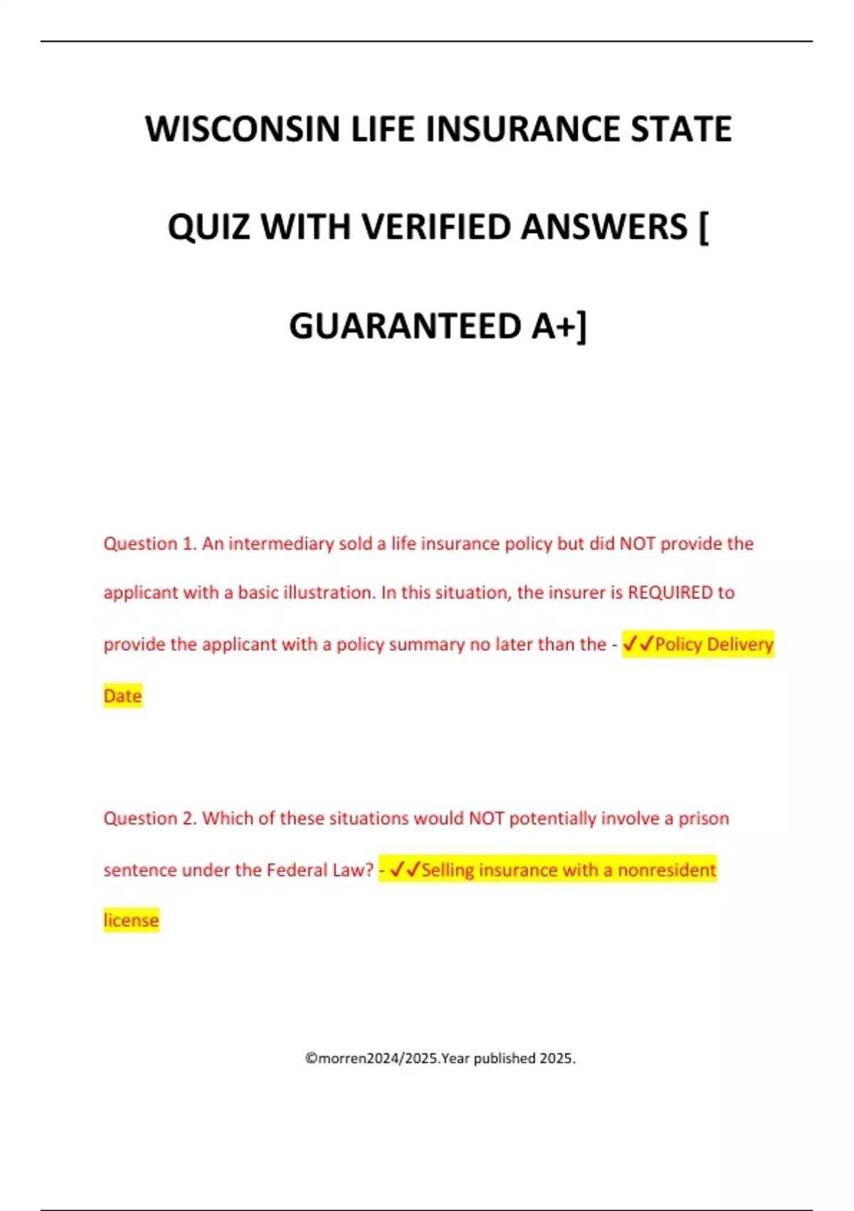 WISCONSIN LIFE INSURANCE STATE QUIZ WITH VERIFIED ANSWERS [ GUARANTEED A+] Question 1. An intermediary sold a life insurance policy but did NOT provide the applicant with a basic illustration. In this situation, the insurer is REQUIRED to provide the applicant with a policy summary no later than the - Policy Delivery Date Question 2. Which of these situations would NOT potentially involve a prison sentence under the Federal Law? - Selling insurance with a nonresident license ©morren2024/2025.Year published 2025.