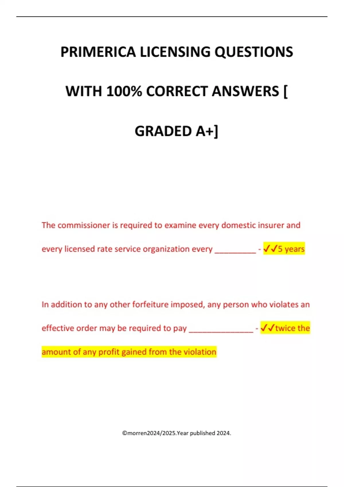 PRIMERICA LICENSING QUESTIONS WITH 100% CORRECT ANSWERS [ GRADED A+] The commissioner is required to examine every domestic insurer and every licensed rate service organization every _________ - 5 years In addition to any other forfeiture imposed, any person who violates an effective order may be required to pay ______________ - twice the amount of any profit gained from the violation ©morren2024/2025.Year published 2024. General duties and powers of the insurance commissioner: The maximum penalty the may be assessed to a person for a willful violation of the insurance code of this state is _________ - 10,000 Forcing a client to buy insurance from a particular lender as a condition of granting a loan is defined as Rebating Misleading advertising defamation coercion - Coercion Which of the following statements is incorrect: Misrepresenting the true nature or facts of a policy or its benefit in order to induce a policy holder to surrender one policy and replace it with another is illegal ©morren2024/2025.Year published 2024.