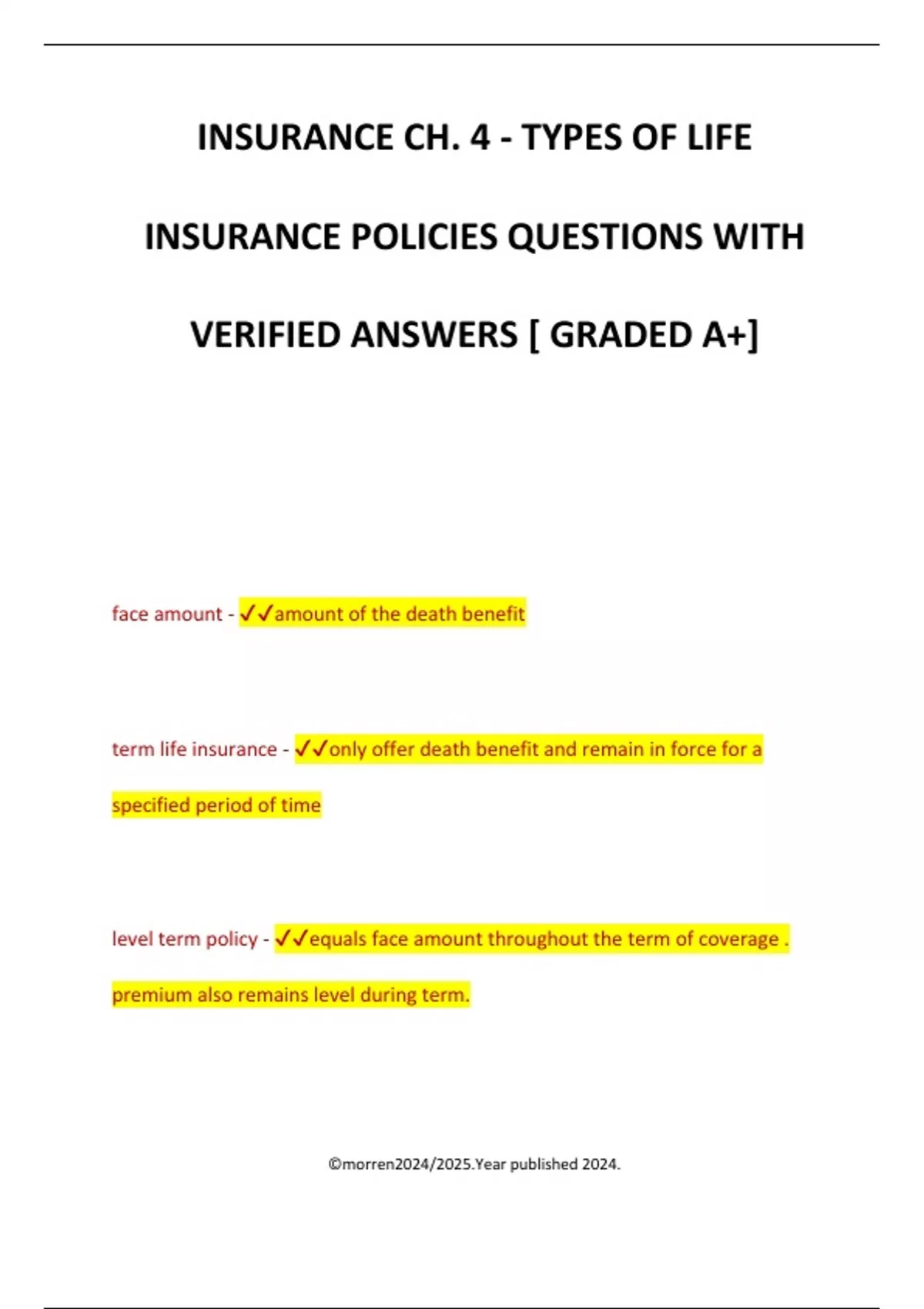 INSURANCE CH. 4 - TYPES OF LIFE INSURANCE POLICIES QUESTIONS WITH VERIFIED ANSWERS [ GRADED A+] face amount - amount of the death benefit term life insurance - only offer death benefit and remain in force for a specified period of time level term policy - equals face amount throughout the term of coverage . premium also remains level during term. ©morren2024/2025.Year published 2024.