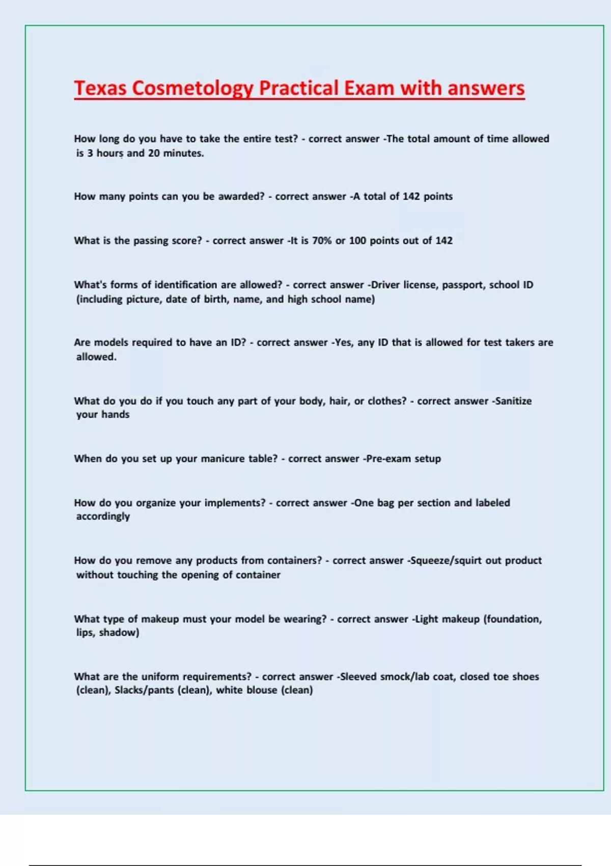 Texas Cosmetology Practical Exam with answers