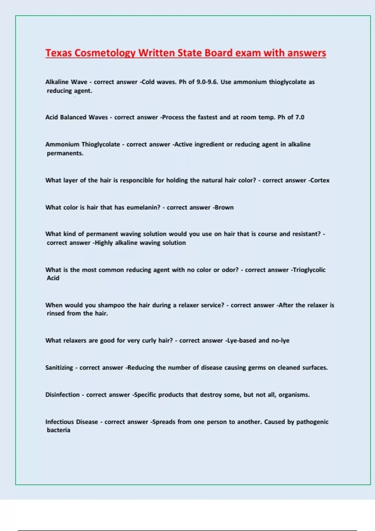Texas Cosmetology Written State Board exam with answers
