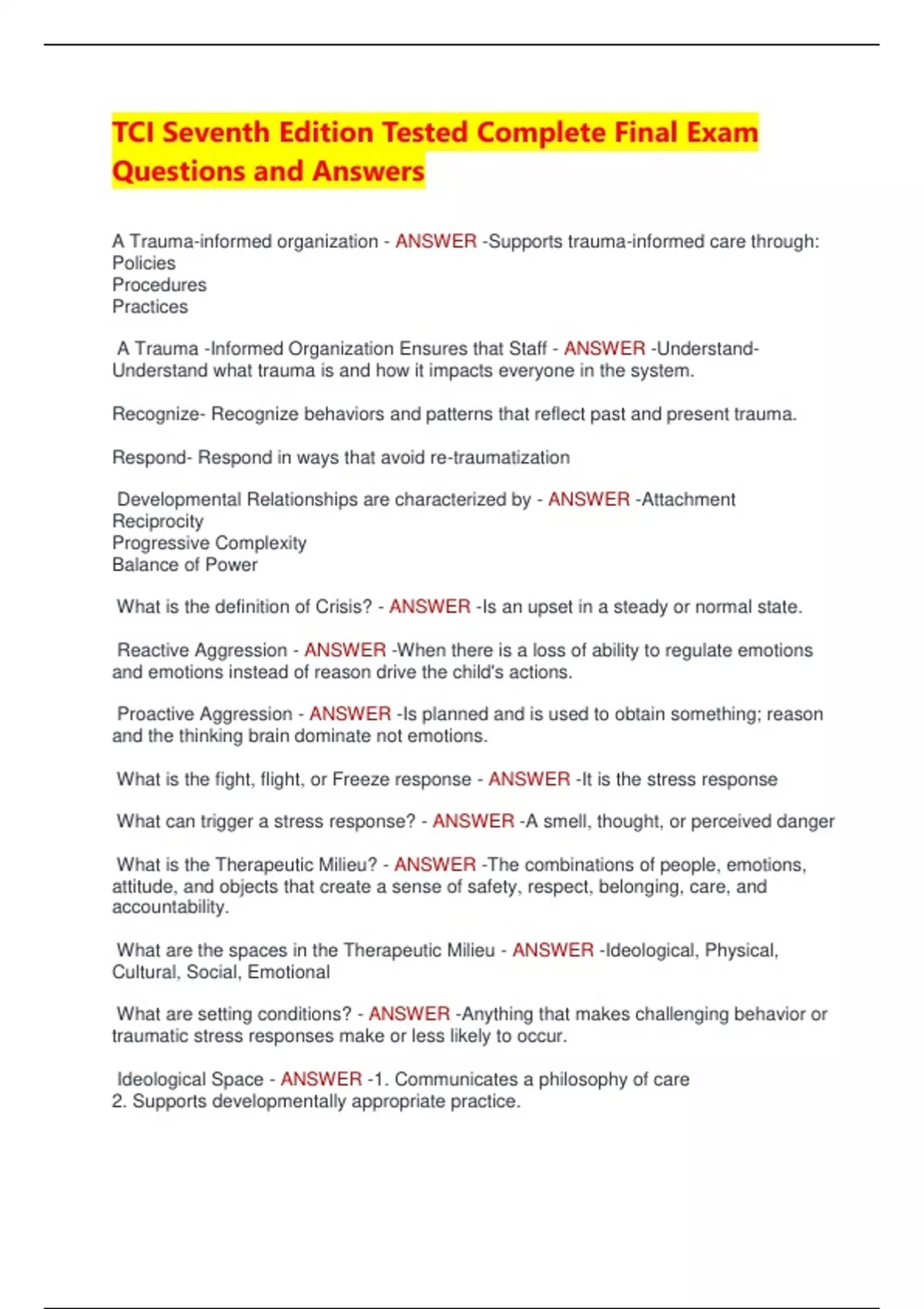 TCI Seventh Edition Tested Complete Final Exam Questions and Answers A Trauma-informed organization - ANSWER -Supports trauma-informed care through: Policies Procedures Practices A Trauma -Informed Organization Ensures that Staff - ANSWER -UnderstandUnderstand what trauma is and how it impacts everyone in the system. Recognize- Recognize behaviors and patterns that reflect past and present trauma. Respond- Respond in ways that avoid re-traumatization Developmental Relationships are characterized by - ANSWER -Attachment Reciprocity Progressive Complexity Balance of Power What is the definition of Crisis? - ANSWER -Is an upset in a steady or normal state. Reactive Aggression - ANSWER -When there is a loss of ability to regulate emotions and emotions instead of reason drive the child's actions. Proactive Aggression - ANSWER -Is planned and is used to obtain something; reason and the thinking brain dominate not emotions. What is the fight, flight, or Freeze response - ANSWER -It is the stress response What can trigger a stress response? - ANSWER -A smell, thought, or perceived danger What is the Therapeutic Milieu? - ANSWER -The combinations of people, emotions, attitude, and objects that create a sense of safety, respect, belonging, care, and accountability. What are the spaces in the Therapeutic Milieu - ANSWER -Ideological, Physical, Cultural, Social, Emotional What are setting conditions? - ANSWER -Anything that makes challenging behavior or traumatic stress responses make or less likely to occur. Ideological Space - ANSWER -1. Communicates a philosophy of care 2. Supports developmentally appropriate practice. 3. Provides opportunities for children to participate successfully in activities. 4. Involves children, families, and staff members in decisions making. 5. Encourages relationship building activities. 6. Creates a learning organization. Physical Space - ANSWER -1. Makes good use of space for personal and public use. 2. Is clean, orderly, inviting. 3. Feels safe and nurturing. 4. Has soft lighting and reasonable calm noise level. 5. Is furnished and decorated appropriately for the age group living there. Cultural Space - ANSWER -1. Develops culturally competence staff 2. Accepts and celebrates cultural difference 3. Supports family connections and involvement. 4. Allows for culturally diverse staff child interactions. Social Space - ANSWER -1. Values attachments and developmental relationships. 2. Balances structure and flexibility to meet individual and group needs. 3. Creates opportunities to participate and contribute. 4. Has goals, structure, and is designed to help children develop skills. 5. Allows for practice of important life skills. Emotional Space - ANSWER -1. Taken into consideration specific effects of trauma 2. Facilitates an atmosphere of safety and acceptance 3. Encourages warm and response relationships 4. Requires emotionally competent staff 5. Allows for development of co regulation and self regulations skills. 4 Foundations for intentional Use of Self - ANSWER -1. Self awareness 2. Self Regulation 3. Relationship skills and attunement 3. Self Care Self Awareness - ANSWER -1. Knowing our own attitudes, values, and beliefs about children and how they influence our behaviors 2. Understanding our own cultural values, fears, and beliefs. 3. Understanding how our previous life experiences can influence current behaviors 4. Knowing our beliefs about trauma and pain-based behavior Self Regulations - ANSWER --Ability to consciously focus attention -Awareness of our own physical and emotional state -Skills to marriage our own emotions and behaviors. -Ability to draw on memory and experience to adapt effectively in the present situation. Relationship Skills and Attunement - ANSWER -To build developmental relationships, adults need to: -Listen and engage the child -"Tune in" to what the child is saying and feeling -Be aware of their own feelings -Respond to the child -Be attuned to how the child is experiencing adults. Self-Care - ANSWER --Monitor personal levels of stress -Maintain a healthy lifestyle -Use reflective supervision Knowing The Child - ANSWER -to help them therapeutically to a child , you need to have a understanding of what is driving the child's emotions and behaviors. The Truine Brain Model - ANSWER -Pail McLean described three basic brain processing regions. The Survival Brain, The Emotional Brain, The Thinking Brain. The Survival Brain - ANSWER -Also known as the reptilian brain. It is responsible for survival functions like breathing, heart rate, circulations and most bodily functions that don't require conscious thought. The Emotional Brain - ANSWER -Also called the limbic system and is for center emotions, emotional behavior, and motivation. This is also amygdala is and is also known as the sentry. Amygdala plays the role to help determine whether or not something is a threat. The Thinking Brain - ANSWER -This is the neocortex and is responsible for higher functions like reasoning, language, creativity and abstract thought. Children with trauma often perceive things differently or sense danger even when there is not. They struggle with emotional regulation. Assessing Behavior - ANSWER -- All behavior has meaning -Behavior reflects emotions and needs -Trauma affects children's ability to manage feeling and behaviors. A Crisis Occurs When: - ANSWER -A child's flight, fight, and freeze response is activated and they are unable to regulate their emotions and behaviors. Goals of Crisis Intervention - ANSWER -1. Support: provide immediate emotional and environmental support to support to reduce and risk and increase child's sense of safety 2. Teach: Help children learn and practice ways to regulate their emotions and behaviors Trauma Driven Perception - ANSWER -Potential Danger Emotional Brain Survival Brain Panic