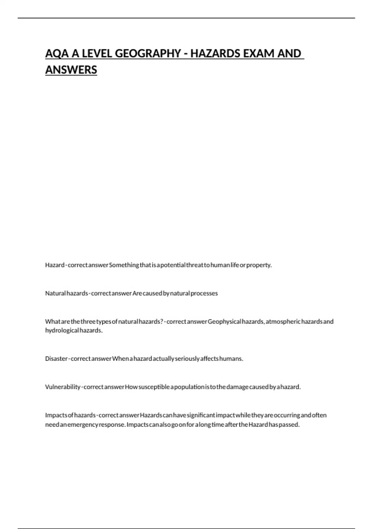Impacts of hazards - correct answer Hazards can have significant impact while they are occurring and often