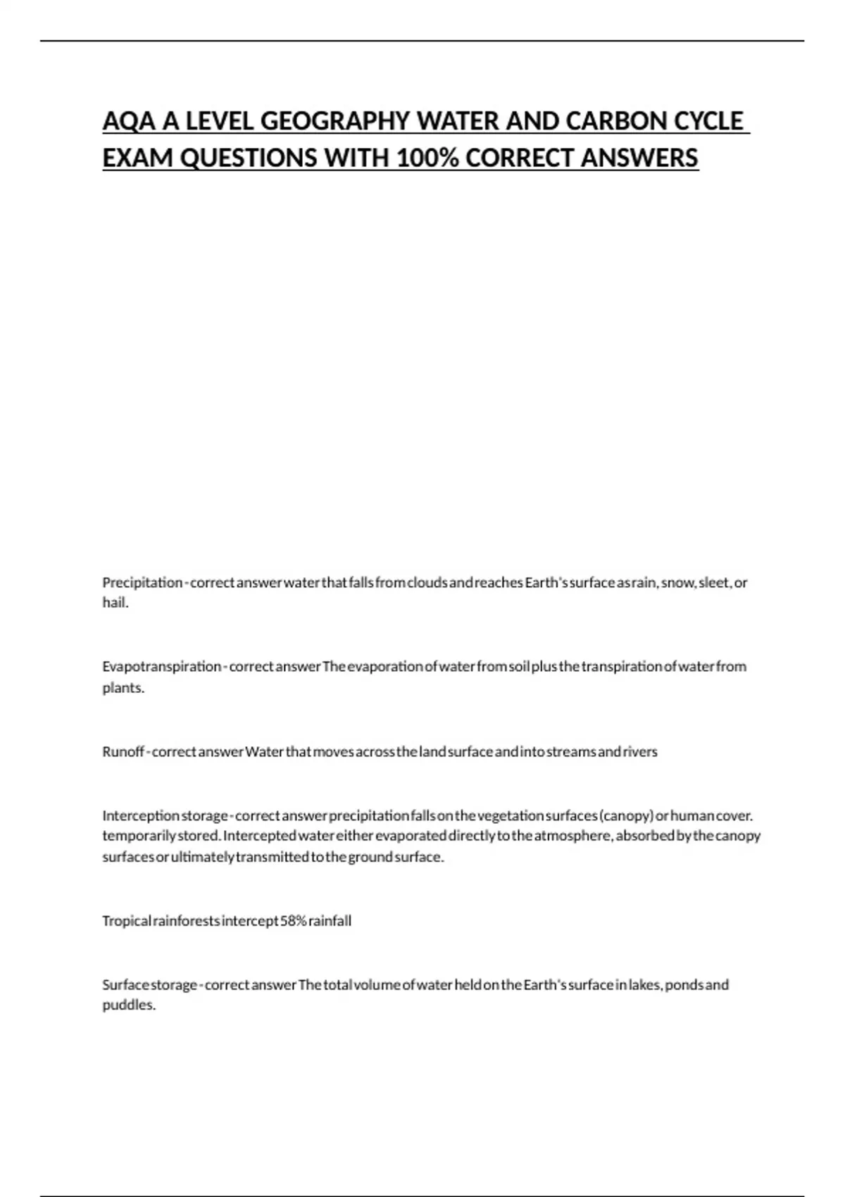 Interception storage - correct answer precipitation falls on the vegetation surfaces (canopy) or human cover.