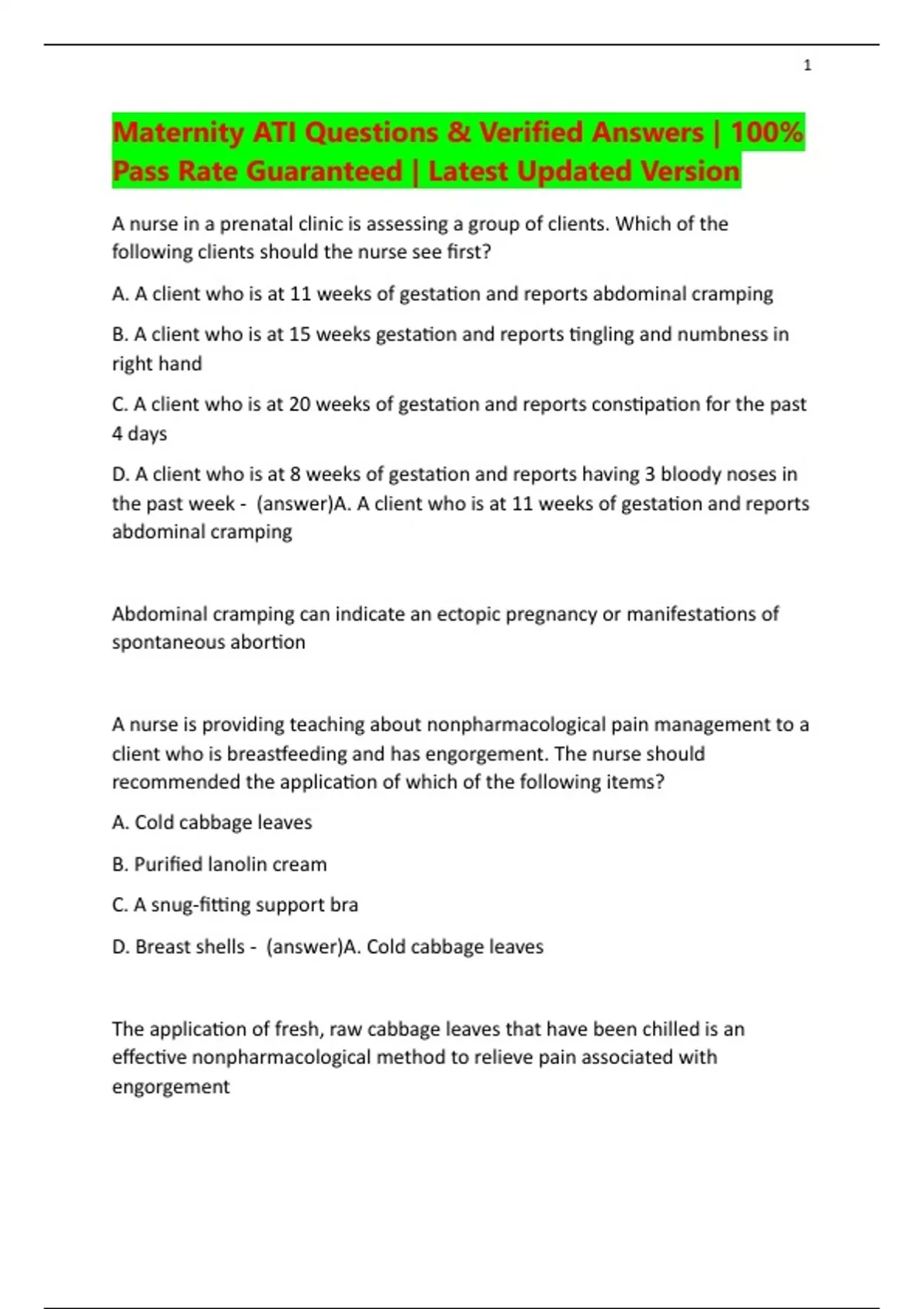 Maternity ATI Questions & Verified Answers | 100% Pass Rate Guaranteed | Latest Updated Version