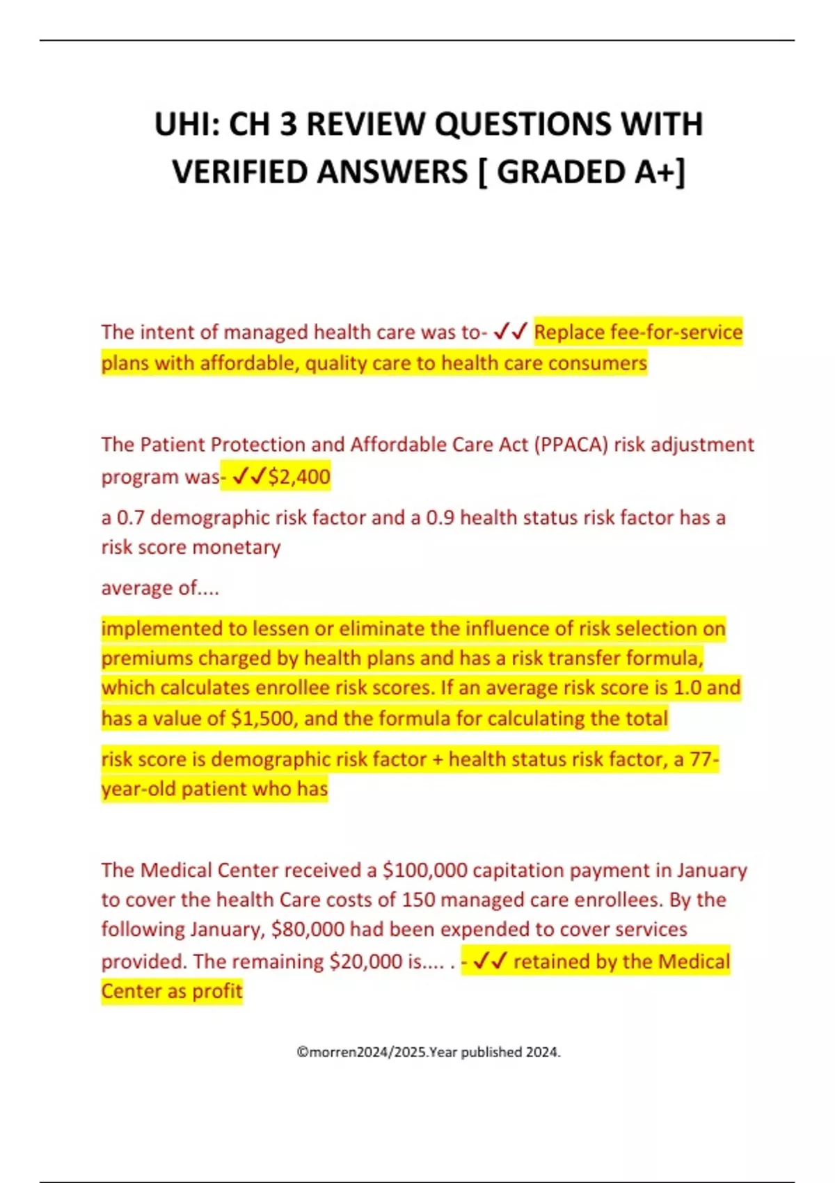 UHI: CH 3 REVIEW QUESTIONS WITH VERIFIED ANSWERS [ GRADED A+] The intent of managed health care was to- Replace fee-for-service plans with affordable, quality care to health care consumers The Patient Protection and Affordable Care Act (PPACA) risk adjustment program was- $2,400 a 0.7 demographic risk factor and a 0.9 health status risk factor has a risk score monetary average of.... implemented to lessen or eliminate the influence of risk selection on premiums charged by health plans and has a risk transfer formula, which calculates enrollee risk scores. If an average risk score is 1.0 and has a value of $1,500, and the formula for calculating the total risk score is demographic risk factor + health status risk factor, a 77 year-old patient who has The Medical Center received a $100,000 capitation payment in January to cover the health Care costs of 150 managed care enrollees. By the following January, $80,000 had been expended to cover services provided. The remaining $20,000 is.... . - retained by the Medical Center as profit ©morren2024/2025.Year published 2024.