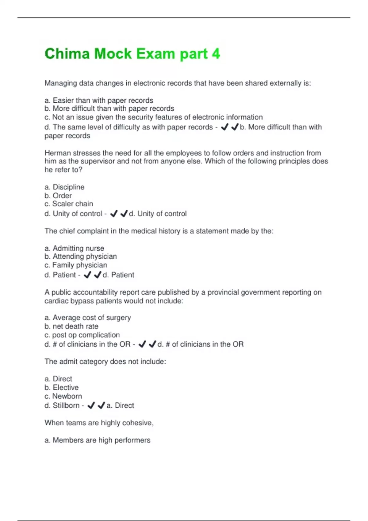 Managing data changes in electronic records that have been shared externally is: a. Easier than with paper records b. More difficult than with paper records c. Not an issue given the security features of electronic information d. The same level of difficulty as with paper records - ️️b. More difficult than with paper records Herman stresses the need for all the employees to follow orders and instruction from him as the supervisor and not from anyone else. Which of the following principles does he refer to? a. Discipline b. Order c. Scaler chain d. Unity of control - ️️d. Unity of control The chief complaint in the medical history is a statement made by the: a. Admitting nurse b. Attending physician c. Family physician d. Patient - ️️d. Patient A public accountability report care published by a provincial government reporting on cardiac bypass patients would not include: a. Average cost of surgery b. net death rate c. post op complication d. # of clinicians in the OR - ️️d. # of clinicians in the OR