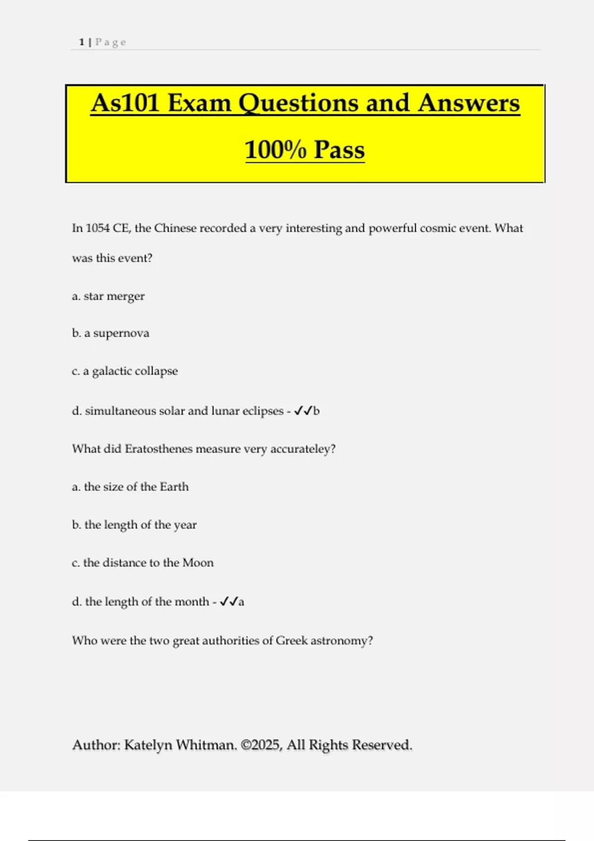 As101 Exam Questions and Answers 100% Pass In 1054 CE, the Chinese recorded a very interesting and powerful cosmic event. What was this event? a. star merger b. a supernova c. a galactic collapse d. simultaneous solar and lunar eclipses - b What did Eratosthenes measure very accurateley? a. the size of the Earth b. the length of the year c. the distance to the Moon d. the length of the month - a Who were the two great authorities of Greek astronomy? 2 | P a g e Author: Katelyn Whitman. ©2025, All Rights Reserved. b. Julius Caesar and Aristotle a. Aristotle and Ptolemy c. Columbus and Ptolemy d. Alexander the Great and Julius Caesar - a Whose writings became so famous that he was known throughout the Middle East simply as "The Philosopher" a. Ptolemy b. Eratosthenes c. Aristotle d. Hipparchus - c Which of the following statements reflects beliefs that were almost universally held in pre Copernican astronomy? a. The planets travelled in elliptical orbits around the Earth. b. The planets travelled in elliptical orbits around the Sun. c. The Sun was at the centre of the universe. d. The Earth was at the centre of the universe. - d In what circumstances is retrograde motion observable? 3 | P a g e Author: Katelyn Whitman. ©2025, All Rights Reserved. a. It is observable for planets located between the Earth and the Sun. b. It is observable for planets more distant from the Sun than the Earth c. It is only observable for the Moon. d. It is observable for all planets. - b You are observing the night sky from Mars. In what circumstances is retrograde motion observable? a. It is observable for planets more distant from the Sun than Mars. b. It is observable for planets located between Mars and the Sun. c. It is only observable for Earth and Venus. d. It is observable for all planets. - a What is the term for the apparent westward motion of a planet in the sky compared to the background stars (as viewed from the Earth) when observed on successive nights? a. epicycle b. retrograde motion c. prograde motion d. heliocentric motion - b What is parallax? 4 | P a g e Author: Katelyn Whitman. ©2025, All Rights Reserved. a. the apparent motion of an object due to the motion of the observer b. the distance between two straight lines. c. the small circle that the planets slide along in Ptolemy's geocentric universe d. the distance between two foci of an ellipse - a Q:10 Why did ancient astronomers believe that the Earth did not move? a. because they could not detect parallax b. because they believed in circular motion c. because all observable planets follow retrograde motion d. because parallax is only detectable during the day - a In Ptolemy's view of the universe, what is at the centre of a planet's epicycle? a. the Sun b. the Earth c. the deferent d. the equant - c Which of the following astronomers described the universe in a way that matches the diagram? a. Kepler 5 | P a g e Author: Katelyn Whitman. ©2025, All Rights Reserved. b. Ptolemy c. Copernicus d. Galileo - b What was the greatest inaccuracy in Copernicus's model of the solar system? the planets travelled in circular orbits with uniform motion b. that the planets travelled on epicycles, the centers of