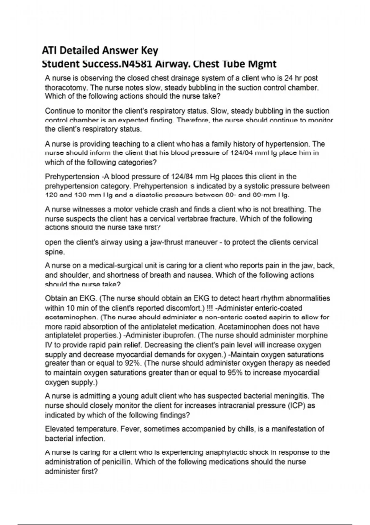 ATI Detailed Answer Key Student Success.N4581 Airway. Chest Tube Mgmt
