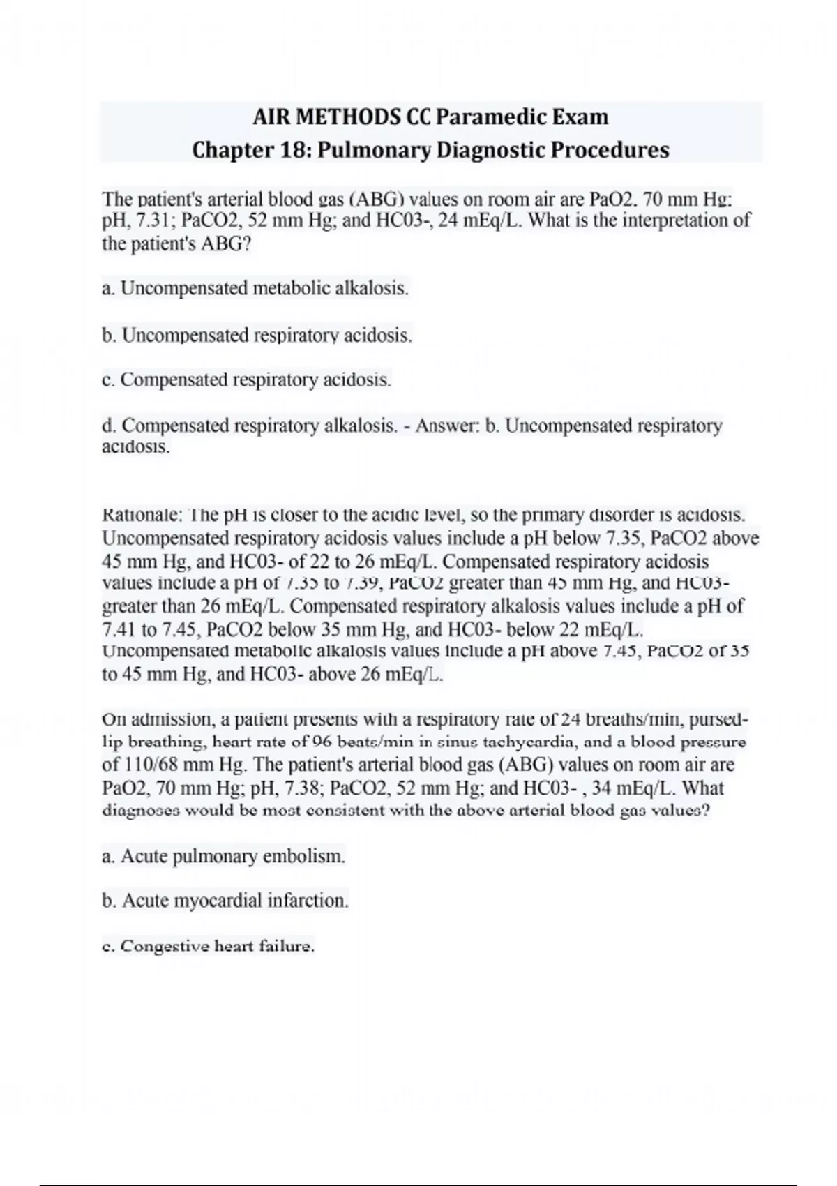 The patient's arterial blood gas (ABG) values on room air are PaO2, 70 mm Hg; pH, 7.31; PaCO2, 52 mm Hg; and HC03-, 24 mEq/L. What is the interpretation of the patient's ABG? a. Uncompensated metabolic alkalosis. b. Uncompensated respiratory acidosis. c. Compensated respiratory acidosis. d. Compensated respiratory alkalosis. - Answer: b. Uncompensated respiratory acidosis. Rationale: The pH is closer to the acidic level, so the primary disorder is acidosis. Uncompensated respiratory acidosis values include a pH below 7.35, PaCO2 above 45 mm Hg, and HC03- of 22 to 26 mEq/L. Compensated respiratory acidosis values include a pH of 7.35 to 7.39, PaCO2 greater than 45 mm Hg, and HC03- greater than 26 mEq/L. Compensated respiratory alkalosis values include a pH of 7.41 to 7.45, PaCO2 below 35 mm Hg, and HC03- below 22 mEq/L. Uncompensated metabolic alkalosis values include a pH above 7.45, PaCO2 of 35 to 45 mm Hg, and HC03- above 26 mEq/L. On admission, a patient presents with a respiratory rate of 24 breaths/min, pursedlip breathing, heart rate of 96 beats/min in sinus tachycardia, and a blood pressure of 110/68 mm Hg. The patient's arterial blood gas (ABG) values on room air are PaO2, 70 mm Hg; pH, 7.38; PaCO2, 52 mm Hg; and HC03- , 34 mEq/L. What diagnoses would be most consistent with the above arterial blood gas values? a. Acute pulmonary embolism. b. Acute myocardial infarction. c. Congestive heart failure. d. Chronic obstructive pulmonary disease. - Answer: d. Chronic obstructive pulmonary disease. Rationale: The fact that the HC03- level has increased enough to compensate for the increased pCO2 level indicates that this is not an acute condition because the kidneys can take several days to adjust. The other choices would present with a lower HC03- level. The values indicate respiratory acidosis, and one of the potential causes is chronic obstructive pulmonary disease. Potential causes for respiratory alkalosis are pulmonary embolism, acute myocardial infarction, and congestive heart failure. On admission, a patient presents with a respiratory rate of 28 breaths/min, heart rate of 108 beats/min in sinus tachycardia, and a blood pressure of 140/72 mm Hg. The patient's arterial blood gas (ABG) values on room air are PaO2, 60 mm Hg; pH, 7.32; PaCO2, 45 mm Hg; and HC03- , 26 mEq/L. What action should the nurse anticipate for this patient? a. Initiate oxygen therapy. b. Prepare for emergency intubation. c. Administer 1 ampule of sodium bicarbonate. d. Initiate capnography. - Answer: a. Initiate oxygen therapy. Rationale: The patient is hypoxemic and oxygen therapy should be initiated at this time. The patient's arterial blood gas (ABG) values do not warrant intubation at this time. Sodium bicarbonate is not indicated because this patient has a normal bicarbonate level. Capnography would not be indicated at this time as the patient's CO2 is normal. A repeat ABG may be ordered to assess the patient's ongoing respiratory status. The patient's arterial blood gas (ABG) values on room air are PaO2, 40 mm Hg; pH, 7.10; PaCO2, 44 mm Hg; and HC03- , 16 mEq/L. What is the interpretation of the patient's ABG? a. Uncompensated respiratory acidosis. b. Uncompensated metabolic acidosis. c. Compensated metabolic acidosis. d. Compensated respiratory acidosis. - Answer: b. Uncompensated metabolic acidosis. Rationale: The pH is below normal range (7.35 to7.45), so this is uncompensated acidosis. The PaCO2 normal and the HC03- is markedly low. This indicates uncompensated metabolic acidosis. Uncompensated metabolic acidosis values include a pH below 7.35, PaCO2 of 35 to 45 mm Hg, and HC03- below 22 mEq/L. Uncompensated respiratory acidosis values include a pH below 7.35, PaCO2 above 45 mm Hg, and HC03- 22 to 26 mEq/L. Compensated metabolic acidosis values include a pH of 7.35 to 7.39, PaCO2 below 35 mm Hg, and HC03- below 22 mEq/L. Compensated respiratory acidosis values include a pH of 7.35 to 7.35, PaCO2 above 45 mm Hg, and HC03- above 26 mEq/L. In a patient who is hemodynamically stable, which procedure can be used to estimate the PaCO2 levels? a. PaO2/FiO2 ratio. b. A-a gradient. c. Residual volume (RV). d. End-tidal CO2. - Answer: d. End-tidal CO2. Rationale: Capnography is the measurement of exhaled carbon dioxide (CO2) gas; it is also known as end-tidal CO2 monitoring. Normally, alveolar and arterial CO2 concentrations are equal in the presence of normal ventilation-perfusion (V/Q) relationships. In a patient who is hemodynamically stable, the end-tidal CO2 (PetCO2) can be used to estimate the PaCO2. Normally, the PaO2/FiO2 ratio is greater than 286; the lower the value, the worse the lung function. The A-a gradient is normally less than 20 mm Hg on room air for patients younger than 61 years. This estimate of intrapulmonary shunting is the least reliable clinically, but it is used often in clinical decision making. Residual volume is the amount of air left in the lung after maximal exhalation. A normal value is 1200 to 1300 mL. A patient presents with the following arterial blood gas (ABG) values: pH, 7.20; PaO2, 106 mm Hg; PaCO2, 35 mm Hg; and HC03-, 11 mEq/L. What is the interpretation of the patient's ABG? a. Uncompensated respiratory acidosis. b. Uncompensated metabolic acidosis. c. Uncompensated metabolic alkalosis. d. Uncompensated respiratory alkalosis. - Answer: b. Uncompensated metabolic acidosis. Rationale: The pH indicates acidosis, and the HC03- is markedly decreased, indicating a metabolic disorder. Uncompensated metabolic acidosis values include a pH below 7.35, PaCO2 of 35 to 45 mm Hg, and HC03- below 22 mEq/L. Uncompensated respiratory acidosis values include a pH below 7.35, PaCO2 above 45 mm Hg, and HC03- of 22 to 26 mEq/L. Uncompensated respiratory alkalosis values include a pH above 7.45, PaCO2 below 35 mm Hg, and HC03- of 22 to 26 mEq/L. Uncompensated metabolic alkalosis values include a pH above 7.45, PaCO2 of 35 to 45 mm Hg, and HC03- above 26 mEq/L A patient has the following ar