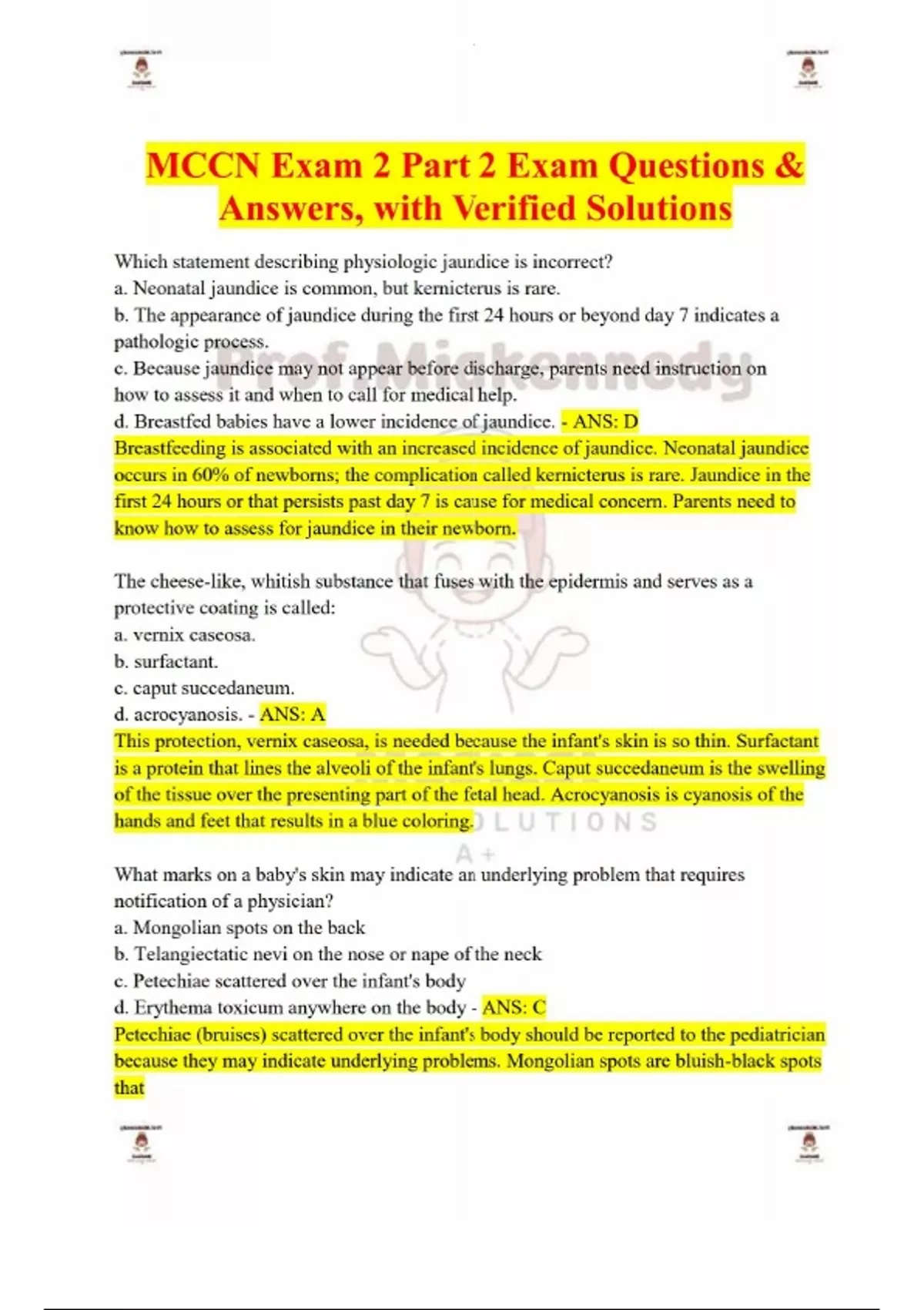 MCCN Exam 2 Part 2 Exam Questions & Answers, with Verified Solutions-Which statement describing physiologic jaundice is incorrect? a. Neonatal jaundice is common, but kernicterus is rare. b. The appearance of jaundice during the first 24 hours or beyond day 7 indicates a pathologic process. c. Because jaundice may not appear before discharge, parents need instruction on how to assess it and when to call for medical help. d. Breastfed babies have a lower incidence of jaundice. - ANS: D Breastfeeding is associated with an increased incidence of jaundice. Neonatal jaundice occurs in 60% of newborns; the complication called kernicterus is rare. Jaundice in the first 24 hours or that persists past day 7 is cause for medical concern. Parents need to know how to assess for jaundice in their newborn. The cheese-like, whitish substance that fuses with the epidermis and serves as a protective coating is called: a. vernix caseosa. b. surfactant. c. caput succedaneum. d. acrocyanosis. - ANS: A This protection, vernix caseosa, is needed because the infant's skin is so thin. Surfactant is a protein that lines the alveoli of the infant's lungs. Caput succedaneum is the swelling of the tissue over the presenting part of the fetal head. Acrocyanosis is cyanosis of the hands and feet that results in a blue coloring. What marks on a baby's skin may indicate an underlying problem that requires notification of a physician? a. Mongolian spots on the back b. Telangiectatic nevi on the nose or nape of the neck c. Petechiae scattered over the infant's body d. Erythema toxicum anywhere on the body - ANS: C Petechiae (bruises) scattered over the infant's body should be reported to the pediatrician because they may indicate underlying problems. Mongolian spots are bluish-black spots that resemble bruises but fade gradually over months and have no clinical significance. Telangiectatic nevi (stork bites, angel kisses) fade by the second year and have no clinical significance. Erythema toxicum is an appalling-looking rash, but it has no clinical significance and requires no treatment. NURSING An examiner who discovers unequal movement or uneven gluteal skinfolds during the Ortolani maneuver would then: a. tell the parents that one leg may be longer than the other, but they will equal out by the time the infant is walking. b. alert the physician that the infant has a dislocated hip. c. inform the parents and physician that molding has not taken place. d. suggest that, if the condition does not change, surgery to correct vision problems may be needed. - ANS: B The Ortolani maneuver is a technique for checking hip integrity. Unequal movement suggests that the hip is dislocated. The physician should be notified. One reason the brain is vulnerable to nutritional deficiencies and trauma in early infancy is the: a. incompletely developed neuromuscular system. b. primitive reflex system. c. presence of various sleep-wake states. d. cerebellum growth spurt. - ANS: D The vulnerability of the brain likely is to the result of the cerebellum growth spurt. The neuromuscular system is almost completely developed at birth. The reflex system is not relevant. The various sleep-wake states are not relevant. The nurse caring for the newborn should be aware that the sensory system least mature at the time of birth is: a. vision. b. hearing. c. smell. d. taste. - ANS: A The visual system continues to develop for the first 6 months. As soon as the amniotic fluid drains from the ear (minutes), the infant's hearing is similar to that of an adult. Newborns have a highly developed sense of smell. The newborn can distinguish and react to various tastes. During life in utero, oxygenation of the fetus occurs through transplacental gas exchange. When birth occurs, four factors combine to stimulate the respiratory center in the medulla. The initiation of respiration then follows. Which is not one of these essential factors? a. Chemical b. Mechanical c. Thermal d. Psychologic - ANS: D Psychologic factor is not one of the essential factors in the initiation of breathing; the fourth factor is sensory. The sensory factors include handling by the provider, drying by the nurse, lights, smells, and sounds. Chemical factors are essential for the initiation of breathing. During labor, decreased levels of oxygen and increased levels of carbon dioxide seem to have a cumulative effect that is involved in the initiation of breathing. Clamping of the cord may also contribute to the start of respirations. Prostaglandins are known to inhibit breathing, and clamping of the cord results in a drop in the level of prostaglandins. Mechanical factors are also necessary to initiate respirations. As the infant passes through the birth canal, the chest is compressed. With birth the chest is relaxed, which allows for negative intrathoracic pressure that encourages air to flow into the lungs. The profound change in temperature between intrauterine and extrauterine life stimulates receptors in the skin to communicate with the receptors in the medulla. This also contributes to the initiation of breathing. A collection of blood between the skull bone and its periosteum is known as a cephalhematoma. To reassure the new parents whose infant develops such a soft bulge, it is important that the nurse be aware that this condition: a. may occur with spontaneous vaginal birth. b. happens only as the result of a forceps or vacuum delivery. c. is present immediately after birth. d. will gradually absorb over the first few months of life. - ANS: A Bleeding may occur during a spontaneous vaginal delivery as a result of the pressure against the maternal bony pelvis. The soft, irreducible fullness does not pulsate or bulge when the infant cries. Low forceps and other difficult extractions may result in bleeding. However, cephalhematomas can also occur spontaneously. The swelling may appear unilaterally or bilaterally and is usually minimal or absent at birth. It increases over the first 2 to