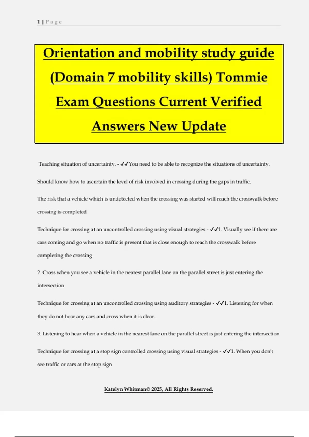 Orientation and mobility study guide (Domain 7 mobility skills) Tommie Exam Questions Current Verified Answers New Update Teaching situation of uncertainty. - You need to be able to recognize the situations of uncertainty. Should know how to ascertain the level of risk involved in crossing during the gaps in traffic. The risk that a vehicle which is undetected when the crossing was started will reach the crosswalk before crossing is completed Technique for crossing at an uncontrolled crossing using visual strategies - 1. Visually see if there are cars coming and go when no traffic is present that is close enough to reach the crosswalk before completing the crossing 2. Cross when you see a vehicle in the nearest parallel lane on the parallel street is just entering the intersection Technique for crossing at an uncontrolled crossing using auditory strategies - 1. Listening for when they do not hear any cars and cross when it is clear. 3. Listening to hear when a vehicle in the nearest lane on the parallel street is just entering the intersection Technique for crossing at a stop sign controlled crossing using visual strategies - 1. When you don't see traffic or cars at the stop sign 2 | P a g e Katelyn Whitman© 2025, All Rights Reserved. 2. When you see that the cars are stopped at the stop sign 3. When you see the protective lane move Technique for crossing at a stop sign controlled crossing with auditory strategies - 1. Listening for no cars at the stop sign and go when it is all clear 2. Listening for when the protective lane starts moving and gets in the middle of the crossing Technique for crossing at a signal controlled crossing using visual strategies - 1. Using pedestrian pushbutton 3. Street crossing with the surge of parallel traffic, recommended when dealing with designated left turn lane 3. Look at the traffic signal for the perpendicular street to determine the color of the signal of the parallel traffic Technique for crossing at a signal controlled crossing using auditory strategies - 1. Crossing clockwise and counterclockwise 2. Using aps when available and appropriate 3. Near lane parallel through traffic for dealing with left turn arrow and for complex signal 4. Crossing with surge of parallel traffic Define a situation of uncertainty - A situation of uncertainty is for a gap of judgment because of undetected vehicles may be just a few seconds away Pedestrian button in the timing of street crossing - The signal notifies the pedestrian of the onset and duration of the walk signal that is the timing during which pedestrian may legally cross 3 | P a g e Katelyn Whitman© 2025, All Rights Reserved. APS information is supplemental to traffic and environment cues and the APS walk indicator only that the walk sign is on not that it is safe to cross What strategies should be used when teaching a learner to use APS - 1. Approach the intersection and stop at the curv, maintaining initial alignment, check alignment by listening to traffic 2. Determine the starting location for crossing and identify tactile cues to realign after pressing the pushbutton What strategies should be used when teaching a learner to use APS continued 1 - 3. Listen and evaluate the intersection, determine the traffic pattern and intersection geometry 4. Leave the curb search for a APS using systematic pattern, starting by making a 180 degree turn and looking on the side of the curb What strategies should be used when teaching a learner to use APS continued 2 - 5. Once located, explore the device and it's functioning, including if there is a tactile arrow and confirm it is pointing the direction you want to cross 6. stand at the pushbutton and while maintaining awareness of crossing location, listen to traffic and the APS for a full cycle to make sure that the sidewalk corresponds with the i