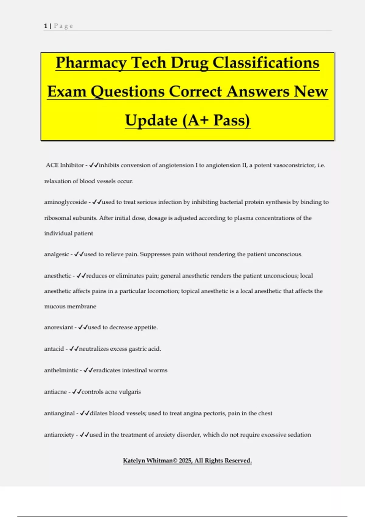 Pharmacy Tech Drug Classifications Exam Questions Correct Answers New Update (A+ Pass) ACE Inhibitor - inhibits conversion of angiotension I to angiotension II, a potent vasoconstrictor, i.e. relaxation of blood vessels occur. aminoglycoside - used to treat serious infection by inhibiting bacterial protein synthesis by binding to ribosomal subunits. After initial dose, dosage is adjusted according to plasma concentrations of the individual patient analgesic - used to relieve pain. Suppresses pain without rendering the patient unconscious. anesthetic - reduces or eliminates pain; general anesthetic renders the patient unconscious; local anesthetic affects pains in a particular locomotion; topical anesthetic is a local anesthetic that affects the mucous membrane anorexiant - used to decrease appetite. antacid - neutralizes excess gastric acid. anthelmintic - eradicates intestinal worms antiacne - controls acne vulgaris antianginal - dilates blood vessels; used to treat angina pectoris, pain in the chest antianxiety - used in the treatment of anxiety disorder, which do not require excessive sedation 2 | P a g e Katelyn Whitman© 2025, All Rights Reserved. antiarrhythmic - drugs used to treat irregular heart rhythms. depresses the action of the heart to combat irregularities in its rhythm. antiarthritic - reduces inflammation of the joints antibacterial - destructive to or preventing the growth of bacteria. kills bacteria(topical) antibiotic - drug used to destroy microorganisms. kills bacteria and prevent infection. anticholestrol - lowers cholestrol levels anticholinergic - drugs that are antagonistic to the action of parasympathetic or other cholinergic nerve fibers anticoagulent - used to prevent blood clot formation. slows clotting of blood; for treatment of thrombosis and embolism or for storage of collected blood anticonvulsant - prevents or arrest seizures antidepressant - agent in treating depression. classifed as SSRIs(selective serotonin specific reuptake inhibitors), TCAs(tricyclic antidepressants), or MAOIs(monamine oxidase inhibitors); elevates mood antidiabetic - used to treat diabetes antidiarrheal - used to treat diarrhea antidiuretic - reduces volume of urine production antidote - neutralizes a poison or counteracts its effect