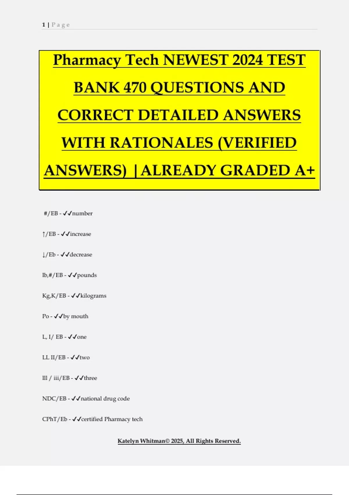 Pharmacy Tech NEWEST 2024 TEST BANK 470 QUESTIONS AND CORRECT DETAILED ANSWERS WITH RATIONALES (VERIFIED ANSWERS) |ALREADY GRADED A+ #/EB - number ↑/EB - increase ↓/Eb - decrease lb,#/EB - pounds Kg,K/EB - kilograms Po - by mouth L, I/ EB - one LL II/EB - two lll / iii/EB - three NDC/EB - national drug code CPhT/Eb - certified Pharmacy tech 2 | P a g e Katelyn Whitman© 2025, All Rights Reserved. RPh/EB - Registered pharamicst PHARMD/EB - doctor of pharmacy PIC/EB - pharmacist in charge IM/EB - intramuscular SC, SQ, subq/EB - subcutaneous IV/EB - intravenous ID/EB - intradermal Sl/EB - sublingual q/EB - every qmonth/EB - every month qweek/EB - every week q2h/EB - every 2 hours q4h/EB - every four hours q6h/Eb - every six to four hours q4-6h/EB - every six hours bid/EB - two times a day Tid/EB - three times a day qd/Eb - every day qid/EB - four times a day 3 | P a g e Katelyn Whitman© 2025, All Rights Reserved. qod/EB - every other day ac/EB - after meal pc/EB - before a meal hs/EB - at bedtime, hour of sleep STAT/EB - immediately am/EB - morning pm/EB - evening gtts(s)/EB - drops fl, f, fl oz/EB - fluid,fluid ounces