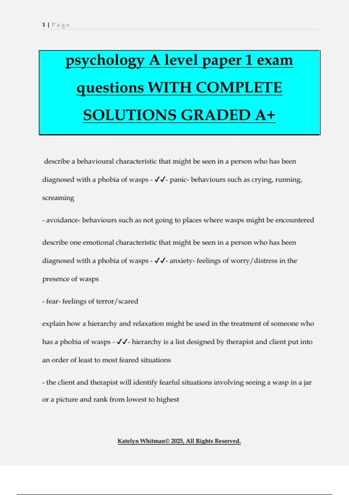 psychology A level paper 1 exam questions WITH COMPLETE SOLUTIONS GRADED A+ describe a behavioural characteristic that might be seen in a person who has been diagnosed with a phobia of wasps - - panic- behaviours such as crying, running, screaming - avoidance- behaviours such as not going to places where wasps might be encountered describe one emotional characteristic that might be seen in a person who has been diagnosed with a phobia of wasps - - anxiety- feelings of worry/distress in the presence of wasps - fear- feelings of terror/scared explain how a hierarchy and relaxation might be used in the treatment of someone who has a phobia of wasps - - hierarchy is a list designed by therapist and client put into an order of least to most feared situations - the client and therapist will identify fearful situations involving seeing a wasp in a jar or a picture and rank from lowest to highest 2 | P a g e Katelyn Whitman© 2025, All Rights Reserved. - client will use relaxation by controlling their breathing -showing them a picture and encouraging using calming techniques to relax and not moving on until relaxed outline the use of one or more drugs in the treatment of OCD - -attempt to increase or decrease levels of neurotransmitters or the activity of neurotransmitters in the brain - antidepressants / SSRIs - prevent the reuptake of serotonin and prolong its activity in the synapse - tricyclics - block the transporter mechanism that reabsorbs both serotonin and noradrenaline - prolonging the activity - antianxiety drugs such as benzodiazepine - enhance activity of GABA so slow down CNS causing relaxation - SNRI - increase levels of serotonin and noradrenaline and are tolerated by those whom SSRIs aren't affective discuss one or more cognitive explanation of depression - - how mental processes affect behaviour - becks theory - faulty info processing, negative schemas, negative triad - Ellis's ABC model - A activating event, B belief, C con