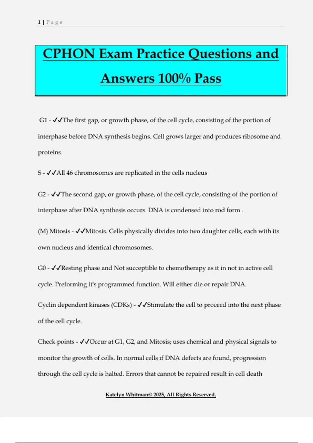 CPHON Exam Practice Questions and Answers 100% Pass G1 - The first gap, or growth phase, of the cell cycle, consisting of the portion of interphase before DNA synthesis begins. Cell grows larger and produces ribosome and proteins. S - All 46 chromosomes are replicated in the cells nucleus G2 - The second gap, or growth phase, of the cell cycle, consisting of the portion of interphase after DNA synthesis occurs. DNA is condensed into rod form . (M) Mitosis - Mitosis. Cells physically divides into two daughter cells, each with its own nucleus and identical chromosomes. G0 - Resting phase and Not succeptible to chemotherapy as it in not in active cell cycle. Preforming it's programmed function. Will either die or repair DNA. Cyclin dependent kinases (CDKs) - Stimulate the cell to proceed into the next phase of the cell cycle. Check points - Occur at G1, G2, and Mitosis; uses chemical and physical signals to monitor the growth of cells. In normal cells if DNA defects are found, progression through the cell cycle is halted. Errors that cannot be repaired result in cell death 2 | P a g e Katelyn Whitman© 2025, All Rights Reserved. (apoptosis). In cancer cells these check points may be defective resulting in uncontrolled proliferation. Apoptosis - Natural cell death and removal by phagocytes. Each normal cell has a limited number of cell divisions. Malignant cells have lost the ability to undergo apoptosis, resulting in immortalization. Inducing apoptosis to these cells via necrosis is the goal of cancer treatments. Proto-oncogenes - normal cellular genes that are important regulators of normal cellular processes, they promote growth. alterations in the expression of these cells result in oncogenes Oncogenes - genes that cause cancer by blocking the normal controls on cell reproduction. Activity of oncogenes produces a constant signal for production in the cell cycle and cause the cell to grow out of control. MYCN associated with neuroblastoma Tumor Supressor Gene - A gene whose protein product inhibits cell division, thereby preventing the uncontrolled cell growth that contributes to cancer. If these genes are damaged or absent, cells lack the appropriate growth inhibiting factors and grow out of control. P53 gene p53 - tumor suppressor gene. Most often mutated in cancers. Hallmark of cancer - Increase in genetic instability and mutation rates. Dividing malignant cells rapidly acquire gentic changes , so tumors are similar but not identical. 3 | P a g e Katelyn Whitman© 2025, All Rights Reserved. This means that with variability in cells one chemotherapy agent may not be effective against all tumor cells. Hematopoietic stem cell - cell in the bone marrow that gives rise to all types of blood cells (neutrophils, monocytes, lymphocytes, erythrocytes, and platelets). Lymphoid lineage - B cells, T cells, NK cells. B cells from the bone marrow, T cells from the thymus myeloid lineage - A subset of bone-marrow derived cells co