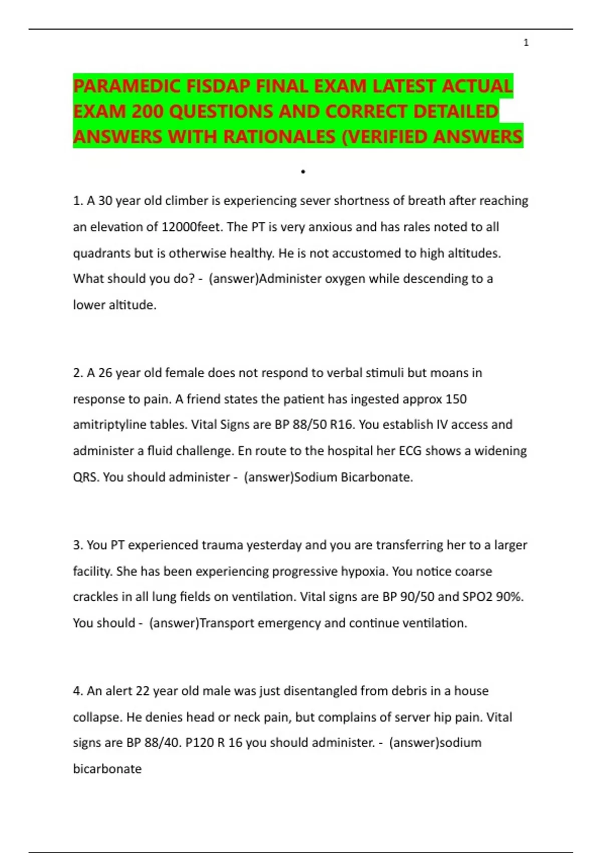 PARAMEDIC FISDAP FINAL EXAM LATEST ACTUAL EXAM 200 QUESTIONS AND CORRECT DETAILED ANSWERS WITH RATIONALES (VERIFIED ANSWERS
