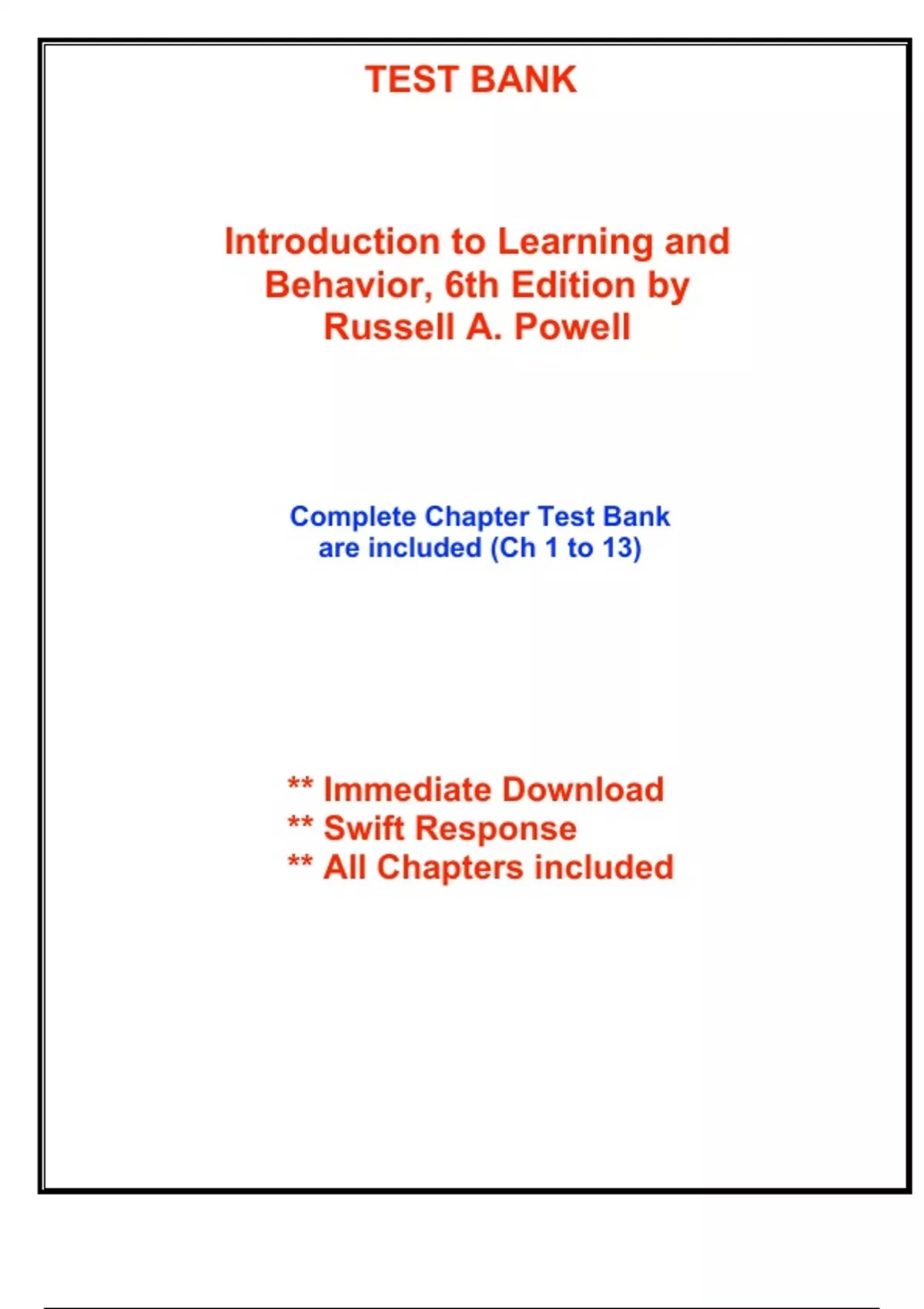 Complete Test Bank for Introduction to Learning and Behavior, 6th Edition by Russell A. Powell, P. Lynne Honey, Diane G. Symbaluk ; ISBN13: 9780357658475...(Full Chapters included and organized in reverse order from Chapter 13 to 1)...1. Introduction. 2. Research Methods. 3. Elicited Behaviors and Classical Conditioning. 4. Classical Conditioning: Basic Phenomena and Various Complexities. 5. Classical Conditioning: Underlying Processes and Practical Applications. 6. Operant Conditioning: Introduction. 7. Schedules and Theories of Reinforcement. 8. Extinction and Stimulus Control. 9. Escape, Avoidance, and Punishment. 10. Choice, Matching, and Self-Control. 11. Observational Learning and Rule-Governed Behavior. 12. Biological Dispositions in Learning. 13. Comparative Cognition.