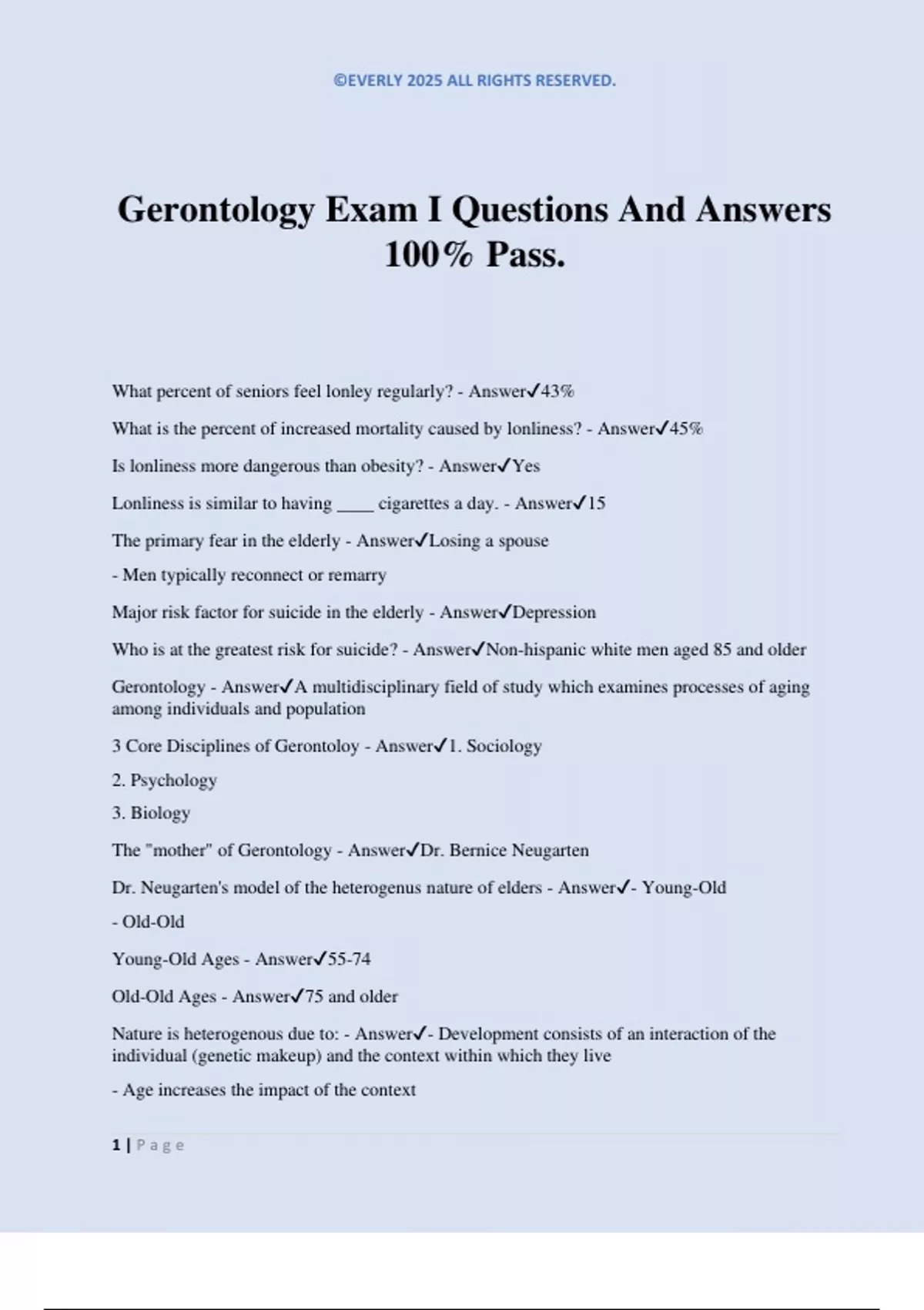 Gerontology Exam I Questions And Answers 100% Pass. What percent of seniors feel lonley regularly? - Answer43% What is the percent of increased mortality caused by lonliness? - Answer45% Is lonliness more dangerous than obesity? - AnswerYes Lonliness is similar to having ____ cigarettes a day. - Answer15 The primary fear in the elderly - AnswerLosing a spouse - Men typically reconnect or remarry Major risk factor for suicide in the elderly - AnswerDepression Who is at the greatest risk for suicide? - AnswerNon-hispanic white men aged 85 and older Gerontology - AnswerA multidisciplinary field of study which examines processes of aging among individuals and population 3 Core Disciplines of Gerontoloy - Answer1. Sociology 2. Psychology 3. Biology The "mother" of Gerontology - AnswerDr. Bernice Neugarten Dr. Neugarten's model of the heterogenus nature of elders - Answer- Young-Old - Old-Old Young-Old Ages - Answer55-74 Old-Old Ages - Answer75 and older Nature is heterogenous due to: - Answer- Development consists of an interaction of the individual (genetic makeup) and the context within which they live - Age increases the impact of the context ©EVERLY 2025 ALL RIGHTS RESERVED. 2 | P a g e - Life experience increase people's diversity across the lifespan Who split the "old-old" category into two? - AnswerDr. Robert Butler of the NIA Dr. Butler's categories of old-old - Answer- Eldery (75-84) - Oldest old (85+) Define aging - Answerthe "accumulation of physical, psychological, social changes in a person over time..." "some dimensions of aging grow and expand over time, while others decline" Dr. Bernice Neugarten theory on how we age - Answer- Identified a timetable for when various life events and actions should ideally occur - Age appropriate behavior Dr. Karl Mannheim theory on how we age - Answer- Generation is a "social location" or cohort - "Biological rhythm" to sharing a cohort Dr. Matilda White Riley theory on how we age - AnswerAge stratification as a perspective to organize times of our lives What will Gerontology enable? - AnswerPublic policy decisions and social programming Dr. Aubrey DeGrey longevity escape - AnswerFinite range of progress with infinite consequences Four Domains of Aging - Answer- Physical/biological change (ex. hair) - Psychological/emotional/mental - Social (role changes) - Spiritual changes Functional dependence/ Geriatric syndrome - Answer- Elders cannot live independently and need help with activities of daily living (ADL) or instrumental activities (IADL) - 1/4 elders Activities of daily living include: - Answer- Chair - Toileting - Nutrition Instrumental activities of daily living include: - Answer- Shopping - Cooking - Paying bills - Transportation