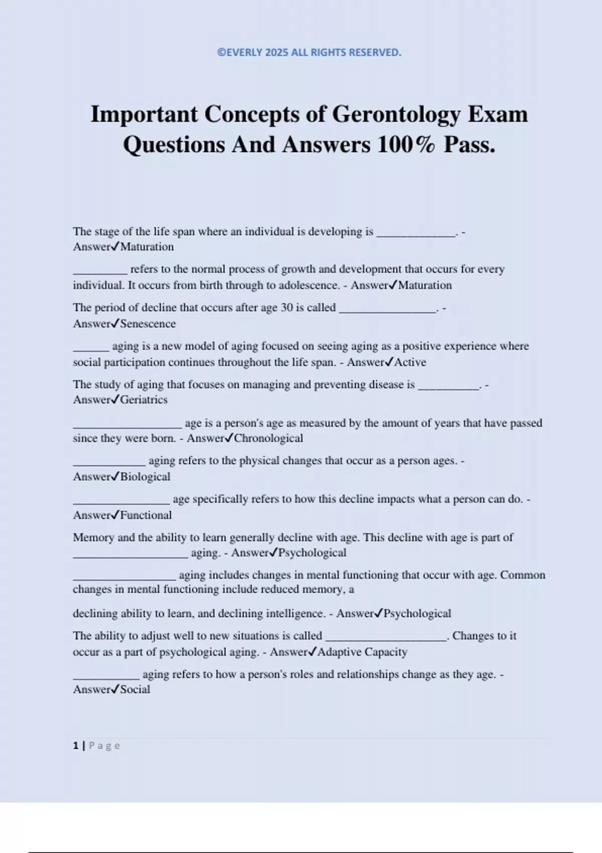 ©EVERLY 2025 ALL RIGHTS RESERVED. 1 | P a g e Important Concepts of Gerontology Exam Questions And Answers 100% Pass. The stage of the life span where an individual is developing is _____________. - AnswerMaturation _________ refers to the normal process of growth and development that occurs for every individual. It occurs from birth through to adolescence. - AnswerMaturation The period of decline that occurs after age 30 is called ________________. - AnswerSenescence ______ aging is a new model of aging focused on seeing aging as a positive experience where social participation continues throughout the life span. - AnswerActive The study of aging that focuses on managing and preventing disease is __________. - AnswerGeriatrics __________________ age is a person's age as measured by the amount of years that have passed since they were born. - AnswerChronological ____________ aging refers to the physical changes that occur as a person ages. - AnswerBiological ________________ age specifically refers to how this decline impacts what a person can do. - AnswerFunctional Memory and the ability to learn generally decline with age. This decline with age is part of ___________________ aging. - AnswerPsychological _________________ aging includes changes in mental functioning that occur with age. Common changes in mental functioning include reduced memory, a declining ability to learn, and declining intelligence. - AnswerPsychological The ability to adjust well to new situations is called ____________________. Changes to it occur as a part of psychological aging. - AnswerAdaptive Capacity ___________ aging refers to how a person's roles and relationships change as they age. - AnswerSocial