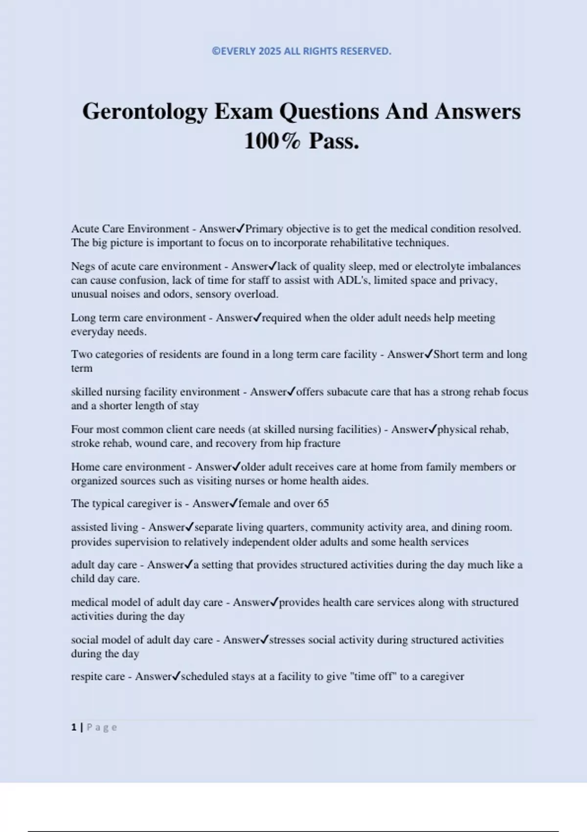 Gerontology Exam Questions And Answers 100% Pass. Acute Care Environment - AnswerPrimary objective is to get the medical condition resolved. The big picture is important to focus on to incorporate rehabilitative techniques. Negs of acute care environment - Answerlack of quality sleep, med or electrolyte imbalances can cause confusion, lack of time for staff to assist with ADL's, limited space and privacy, unusual noises and odors, sensory overload. Long term care environment - Answerrequired when the older adult needs help meeting everyday needs. Two categories of residents are found in a long term care facility - AnswerShort term and long term skilled nursing facility environment - Answeroffers subacute care that has a strong rehab focus and a shorter length of stay Four most common client care needs (at skilled nursing facilities) - Answerphysical rehab, stroke rehab, wound care, and recovery from hip fracture Home care environment - Answerolder adult receives care at home from family members or organized sources such as visiting nurses or home health aides. The typical caregiver is - Answerfemale and over 65 assisted living - Answerseparate living quarters, community activity area, and dining room. provides supervision to relatively independent older adults and some health services adult day care - Answera setting that provides structured activities during the day much like a child day care. medical model of adult day care - Answerprovides health care services along with structured activities during the day social model of adult day care - Answerstresses social activity during structured activities during the day respite care - Answerscheduled stays at a facility to give "time off" to a caregiver ©EVERLY 2025 ALL RIGHTS RESERVED. 2 | P a g e 6 services available for those caring for older adults at home - Answerrespite care, day care, home health, nutrition programs, senior center, transportation services home health - Answerassistance with ADL's via aide or nursing care via nurses at home nutrition programs - Answercongregate meals or home delivery for a nominal fee, senior centers, meals on wheels senior center - AnswerGov funded centers that provide recreational activities, lunch, health screening, and transportation to and from the site transportation services - Answertransportating services for grocery shopping or medical appts Age related changes - Answerabsorption, distribution, metabolism, excretion, increased sensitivity, decreased sensitivity, adverse drug reaction absorption - Answerstomach contents become more alkaline, blood flow to intestines and motility is slowed leading to slower absorption NI for absorption - Answeralways administer meds on time distribution - Answerslower d/t decreased circulation, decreased body water & increased body fat causing a sustained release and the drug to remain in the body longer. Can cause greater effects or toxicity NI for distribution - AnswerStart low with dosage and go slow, checking for toxicity metabolism - Answeroccurs in the liver. decrease in liver size and blood flow and functions in the kidney NI for metabolism - AnswerA little goes a long way excretion - Answeroccurs in the kidney and is slowed due to reduced blood flow and function in the kidneys NI for excretion - Answerlower doseages recommended increased sensitivity - Answercan be increased with CNS drugs NI for increased sensitivity - Answermonitor and assess decreased sensitivity - Answercan be decreased with cardiac drugs NI for decreased sensitivity - Answermonitor and assess adverse drug reactions - Answernot always typical and can arise after a drug is D/Cd NI for adverse drug reactions - Answermonitor, assess, report, document Factors that can lead to medication misuse - Answerloss of manual strength, decreased dexterity, visual changes, memory deficits, knowledge deficits, cultural values, financial concerns