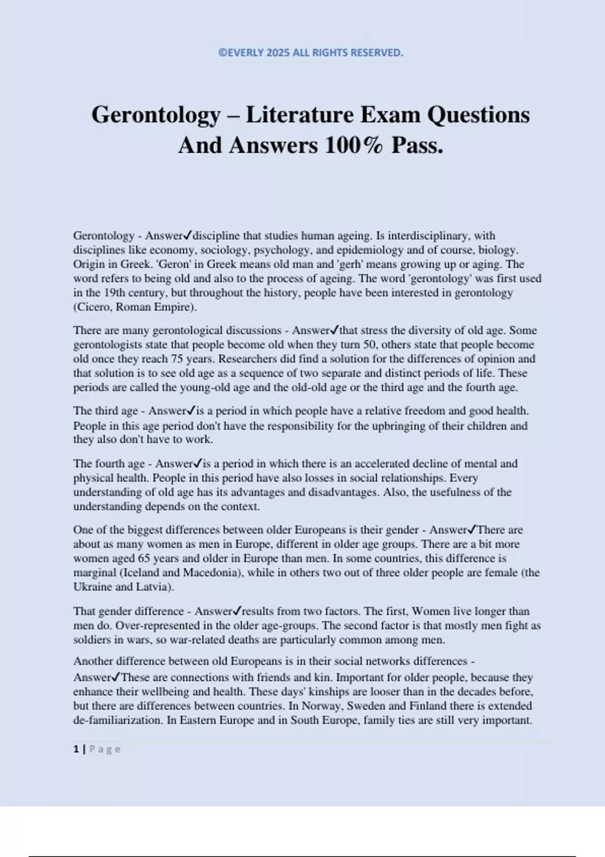 Gerontology – Literature Exam Questions And Answers 100% Pass. Gerontology - Answerdiscipline that studies human ageing. Is interdisciplinary, with disciplines like economy, sociology, psychology, and epidemiology and of course, biology. Origin in Greek. 'Geron' in Greek means old man and 'gerh' means growing up or aging. The word refers to being old and also to the process of ageing. The word 'gerontology' was first used in the 19th century, but throughout the history, people have been interested in gerontology (Cicero, Roman Empire). There are many gerontological discussions - Answerthat stress the diversity of old age. Some gerontologists state that people become old when they turn 50, others state that people become old once they reach 75 years. Researchers did find a solution for the differences of opinion and that solution is to see old age as a sequence of two separate and distinct periods of life. These periods are called the young-old age and the old-old age or the third age and the fourth age. The third age - Answeris a period in which people have a relative freedom and good health. People in this age period don't have the responsibility for the upbringing of their children and they also don't have to work. The fourth age - Answeris a period in which there is an accelerated decline of mental and physical health. People in this period have also losses in social relationships. Every understanding of old age has its advantages and disadvantages. Also, the usefulness of the understanding depends on the context. One of the biggest differences between older Europeans is their gender - AnswerThere are about as many women as men in Europe, different in older age groups. There are a bit more women aged 65 years and older in Europe than men. In some countries, this difference is marginal (Iceland and Macedonia), while in others two out of three older people are female (the Ukraine and Latvia). That gender difference - Answerresults from two factors. The first, Women live longer than men do. Over-represented in the older age-groups. The second factor is that mostly men fight as soldiers in wars, so war-related deaths are particularly common among men. Another difference between old Europeans is in their social networks differences - AnswerThese are connections with friends and kin. Important for older people, because they enhance their wellbeing and health. These days' kinships are looser than in the decades before, but there are differences between countries. In Norway, Sweden and Finland there is extended de-familiarization. In Eastern Europe and in South Europe, family ties are still very important. ©EVERLY 2025 ALL RIGHTS RESERVED. 2 | P a g e Another big difference between older Europeans is their socio-economic status differences - Answertells us the position a person has in society. Is determined from wealth, occupation and educational level. The wealth of older Europeans is relatively low in Eastern European and relatively high in continental European countries. The educational level is also higher in Continental Europe and Northern Europe, than in Southern Europe, like Spain and Greece. Also, the occupational prestige of older people is higher in Continental and Northern Europe than in Southern Europe. Health differences in Europe - Answer(Men have higher self-perceived health) Level of resources for health care is the lowest and the people from those countries have the highest prevalence of smoking and obesity. By contrast, in Northern and Western Europe, people have the best health care and the lowest level of risk factors for diseases. There are variations within the regions. The highest proportion of obese men can be found in the Czech Republic (31%), but the lowest proportion of obese men can also be found in Eastern Europe, in Moldova (10%). Gerontology - AnswerThe study of these components and their interrelations. Components are biological, social, spiritual, environmental and psychological in nature. The sub-discipline of gerontology which focuses on physical processes, is called bio- and health gerontology. Bio-gerontology - Answerbiologists and biochemists study the process of ageing on a molecular level and they try to figure out how the ageing process affects organs and the entire body. Some of the questions answered by biogerontologists are why human cells die and how organs stay stable over time. These scientists see biological ageing of the body as the result of the appearance and disappearance of the cells of organs. Biological aging - AnswerOrgans have cells that die and that are replaced by new cells. De Grey is a biogerontologist, concluded that ageing can be seen as a disease. However, some gerontologists think that he is being too optimistic. This is because biogerontologists use animals like rats and flies for their studies and it is not clear whether these results can be generalized to humans. Health gerontology - AnswerDoctors who do clinical research and epidemiologists. Is linked to the environmental and social aspects of human ageing. How biological changes affect daily lives and how health care services have to adapt. Questions with which health gerontologists are concerned with are how one can help people to live longer and how one can increase the healthy life expectancy. Looks at social inequalities when trying to answer the questions. This can be between different educational levels or income groups. two levels of health-related intervention are underlined. These levels are the individual level and the population level. The individual level might focus on health promotion and prevention and the population level might focus on housing conditions and organization of social care systems. Looking at the traditional definition of health - Answerhealth is the absence of disease. When people age, their health deteriorates and people develop diseases. Old age and good health were therefore seen as mutually exclusive states. This opposition can be expla