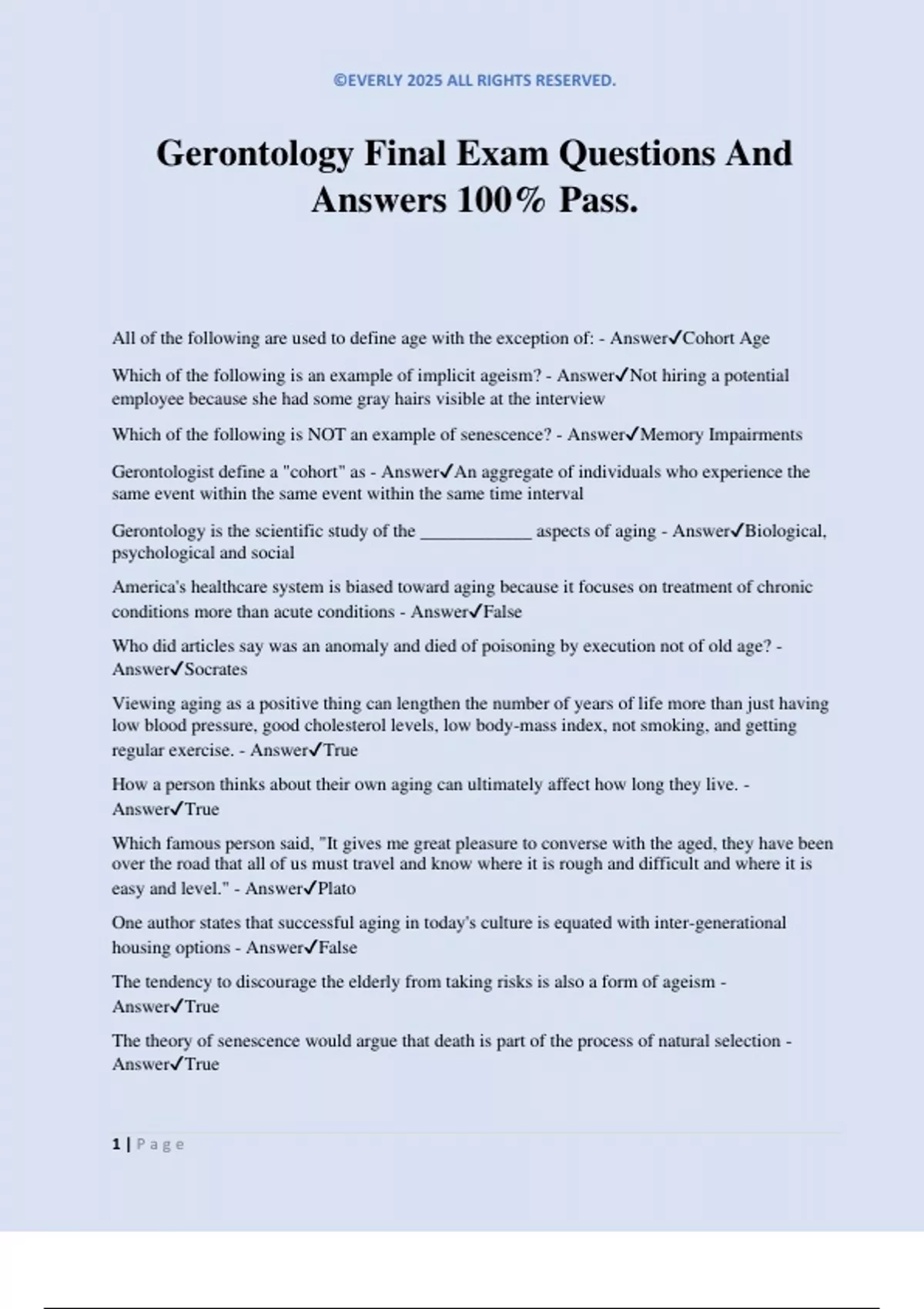 Gerontology Final Exam Questions And Answers 100% Pass. All of the following are used to define age with the exception of: - AnswerCohort Age Which of the following is an example of implicit ageism? - AnswerNot hiring a potential employee because she had some gray hairs visible at the interview Which of the following is NOT an example of senescence? - AnswerMemory Impairments Gerontologist define a "cohort" as - AnswerAn aggregate of individuals who experience the same event within the same event within the same time interval Gerontology is the scientific study of the ____________ aspects of aging - AnswerBiological, psychological and social America's healthcare system is biased toward aging because it focuses on treatment of chronic conditions more than acute conditions - AnswerFalse Who did articles say was an anomaly and died of poisoning by execution not of old age? - AnswerSocrates Viewing aging as a positive thing can lengthen the number of years of life more than just having low blood pressure, good cholesterol levels, low body-mass index, not smoking, and getting regular exercise. - AnswerTrue How a person thinks about their own aging can ultimately affect how long they live. - AnswerTrue Which famous person said, "It gives me great pleasure to converse with the aged, they have been over the road that all of us must travel and know where it is rough and difficult and where it is easy and level." - AnswerPlato One author states that successful aging in today's culture is equated with inter-generational housing options - AnswerFalse The tendency to discourage the elderly from taking risks is also a form of ageism - AnswerTrue The theory of senescence would argue that death is part of the process of natural selection - AnswerTrue ©EVERLY 2025 ALL RIGHTS RESERVED. 2 | P a g e Social gerontology is a sub-field of gerontology, concerned primarily with the physiological changes brought on by age - AnswerFalse _________ is the greatest number of years any member of a species has been known to survive - AnswerLife span Most recent immigrants to the US can trace their ancestry to: - AnswerAsia and Latin America Which of the following statements is NOT a characteristic of the Echo Boomers? - AnswerMembers of this cohort were born between 1964 and 1979 The fastest growing segment of the aging population is: - Answeroldest old (85 and over) ____________ is the study of population processes - fertility, mortality, and migration. - AnswerDemography If you wanted to market a product to African American Baby Boomers, who would be best to network with so that you message got to the target population? - AnswerNot the men of the household - dont have the right answer Which state in the US reached the majority- minority milestone first in 2015? - AnswerCalifornia Which of the following suggestions did an author give to policymakers that could improve the outlook for the future in the US? - AnswerWork to reduce the gaps in education, employment and earning of younger workers. In the 1900s young immigrants entered the United States through Boston Harbor - AnswerFalse Birth rate is the average number of births per generation - AnswerFalse A supercentenarian is the term used for anyone over the age of 100 - AnswerTrue The census bureau makes a national count of the population every five years - AnswerFalse According to the Guinness Book of World Records video, a women from Italy is the title holder for oldest person - AnswerFalse According to the Activity theory: - Answersuccessful aging is active aging A theory is: - Answera broad explanation that provides the structure for organizing and interpreting multiple observable facts and their relationship to one another The first practitioners of social gerontology were - AnswerDevelopmental psychologists The feminist theory of aging notes that: - Answermen and women experience aging differently because of the organization of social structure and gendered social definition of reality Other people are likley to form a subculture because - AnswerThey are isolated from young people and share common experiences with older people