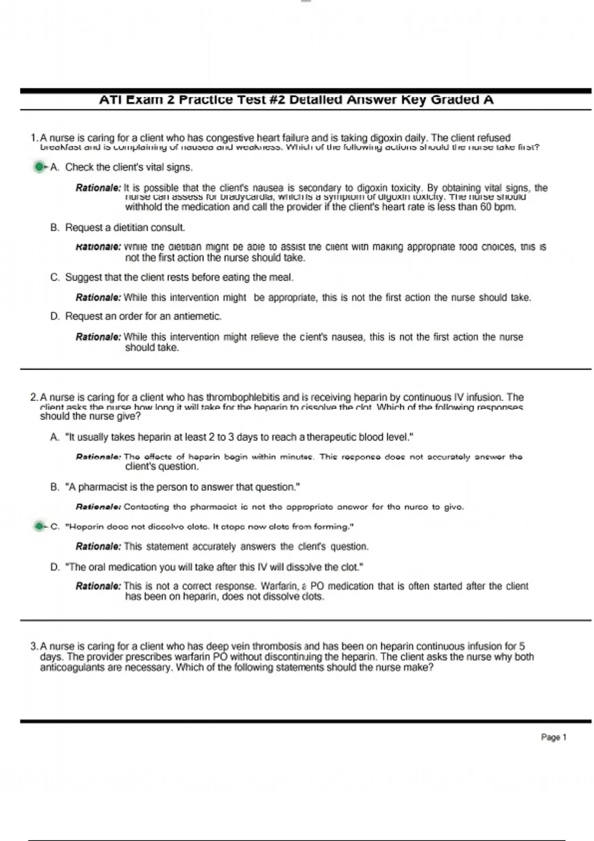 1. A nurse is caring for a client who has congestive heart failure and is taking digoxin daily. The client refused breakfast and is complaining of nausea and weakness. Which of the following actions should the nurse take first? A. Check the client's vital signs. Rationale: It is possible that the client's nausea is secondary to digoxin toxicity. By obtaining vital signs, the nurse can assess for bradycardia, which is a symptom of digoxin toxicity. The nurse should withhold the medication and call the provider if the client's heart rate is less than 60 bpm. B. Request a dietitian consult. Rationale: While the dietitian might be able to assist the client with making appropriate food choices, this is not the first action the nurse should take. C. Suggest that the client rests before eating the meal. Rationale: While this intervention might be appropriate, this is not the first action the nurse should take. D. Request an order for an antiemetic. Rationale: While this intervention might relieve the client's nausea, this is not the first action the nurse should take. 2. A nurse is caring for a client who has thrombophlebitis and is receiving heparin by continuous IV infusion. The client asks the nurse how long it will take for the heparin to dissolve the clot. Which of the following responses should the nurse give? A. "It usually takes heparin at least 2 to 3 days to reach a therapeutic blood level." Rationale: The effects of heparin begin within minutes. This response does not