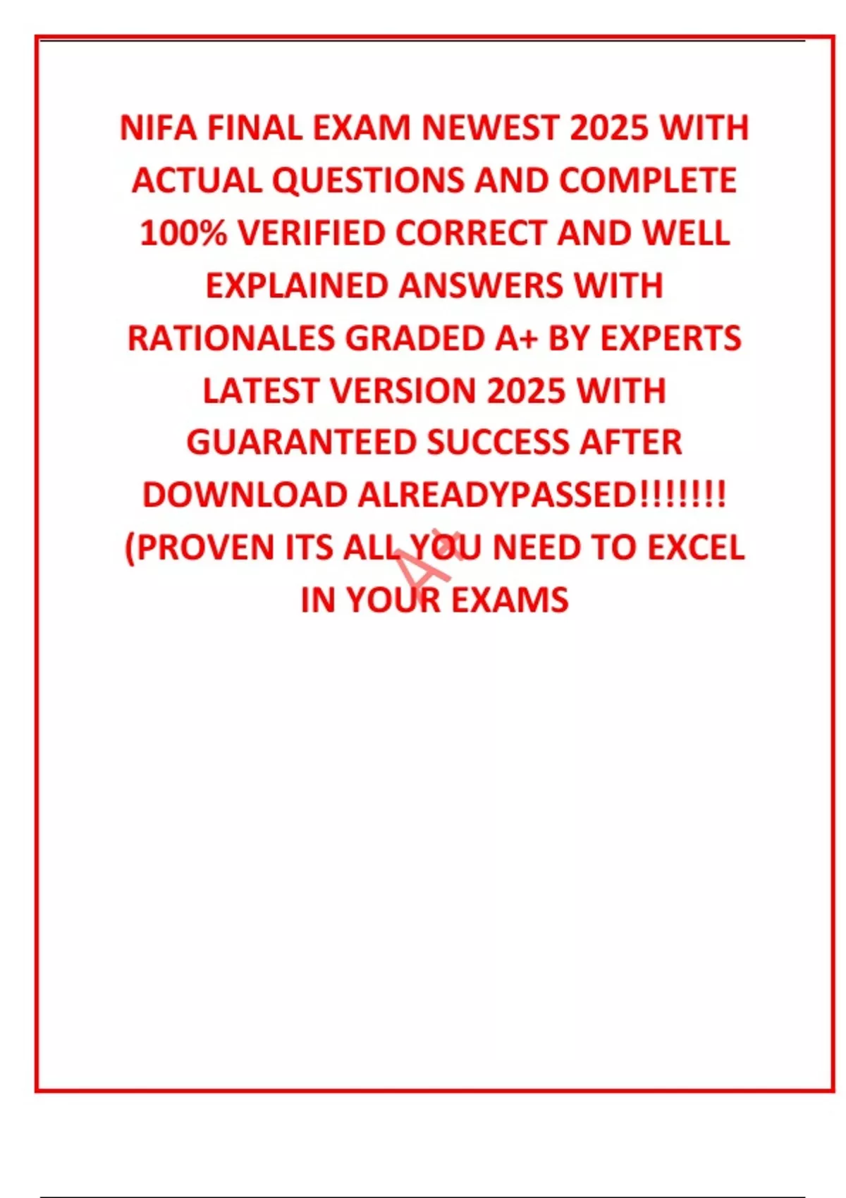 NIFA FINAL EXAM NEWEST 2025 WITH ACTUAL QUESTIONS AND COMPLETE 100% VERIFIED CORRECT AND WELL EXPLAINED ANSWERS WITH RATIONALES GRADED A+ BY EXPERTS LATEST VERSION 2025 WITH GUARANTEED SUCCESS AFTER DOWNLOAD ALREADYPASSED!!!!!!! (PROVEN ITS ALL YOU NEED TO EXCEL IN YOUR EXAMS A neutral zone is a predetermined location on the surgical field where sharps are placed for retrieval by the surgeon. Which of the following is a best practice for the use of the neutral zone? Announce the transfer of each sharp before placing it in the neutral zone. Which of the following may be a consequence of high-dose or full-body radiation? Nausea, vomiting, and diarrhea Exposure to blood-borne pathogens occurs during all phases of the perioperative process. Observing safety precautions during all phases of surgery, from setup to cleanup, reduces the number of injuries and exposures for all OR personnel. For the prevention of sharps injuries in the pre-procedure and post-procedure phases, which safe handling practices reflect appropriate nursing actions? Use standardized sterile field setups throughout the surgical service department. Transport reusable sharps in a safe, closed container to the decontamination cleanup area. Do not place hands or fingers into a container to dispose of a device. Inspect the sharps container for overfilling before discarding disposable sharps in it. Which list of medications best reflects medications indicated for latex sensitivity therapeutic management? Epinephrine, prednisone, and a beta-agonist inhaler While antibiotics have been credited with saving lives, misuse of antibiotics has contributed to the evolution of multidrug-resistant organisms (MDROs). Select the antibiotic application that has evident to support it as a best practice and not, potentially, a misuse of antibiotics. Antibiotics given intravenously within 1 hour of the incision for every procedure with an incision or entered body system.