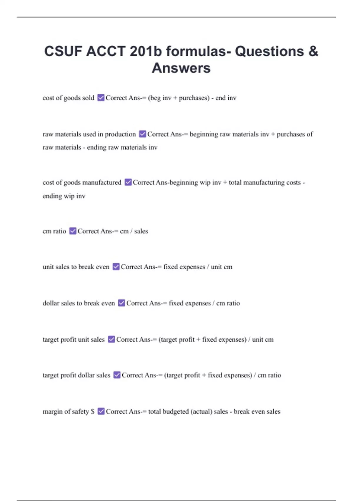 CSUF ACCT 201b formulas- Questions & Answers cost of goods sold Correct Ans-= (beg inv + purchases) - end inv