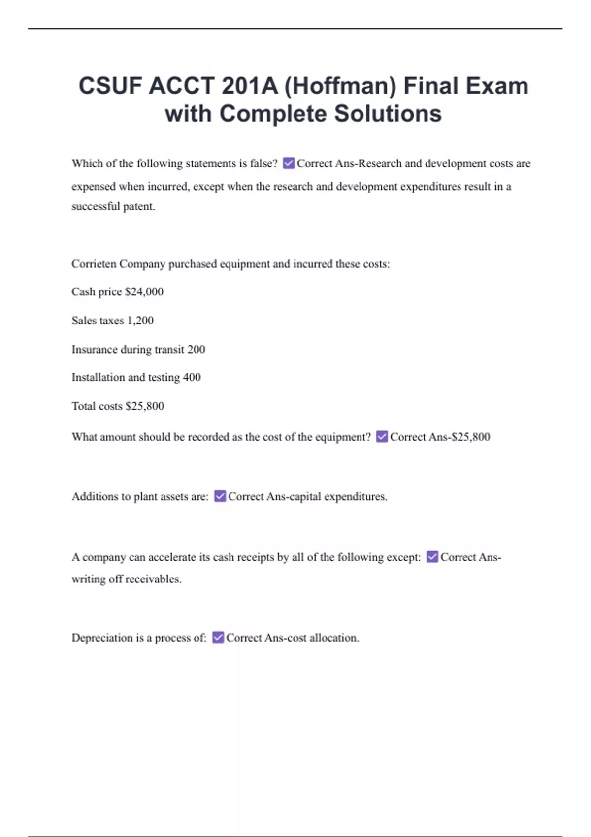 CSUF ACCT 201A (Hoffman) Final Exam with Complete Solutions Which of the following statements is false? Correct Ans-Research and development costs are expensed when incu