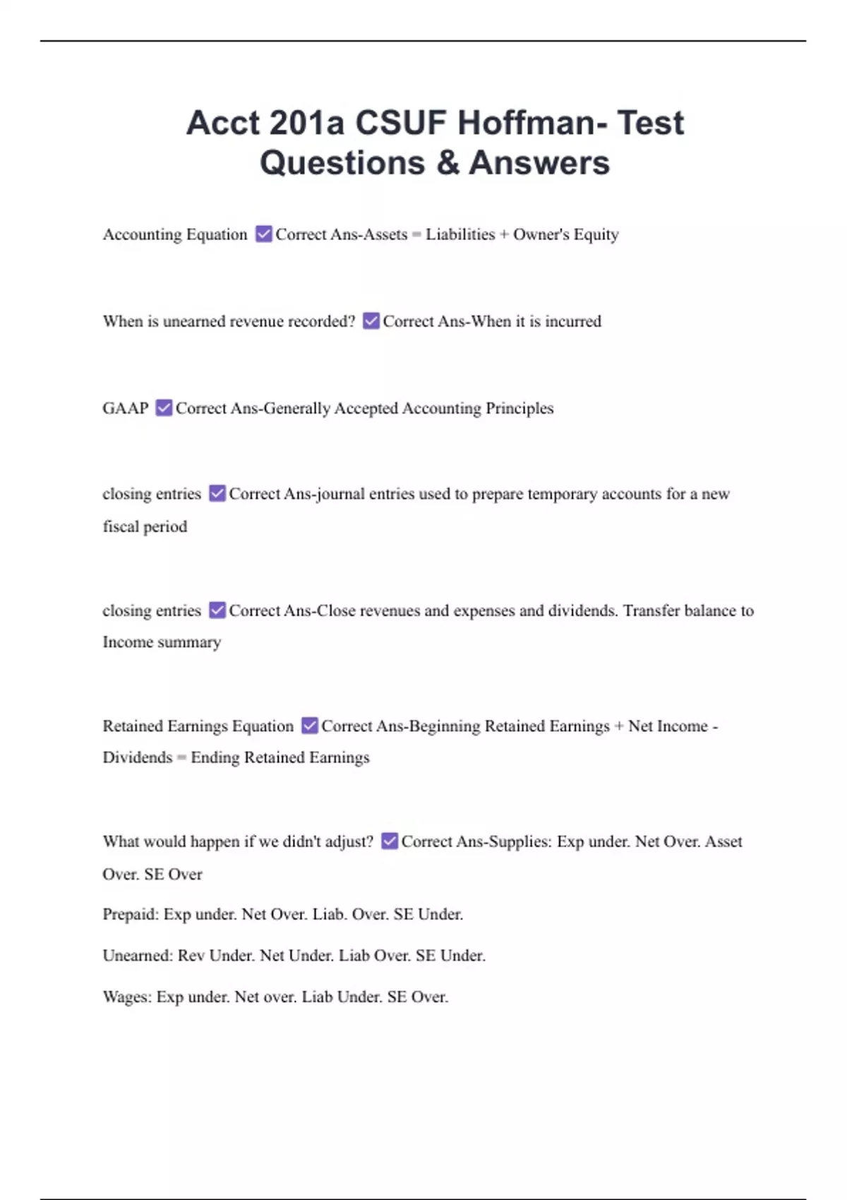 Accounting Equation Correct Ans-Assets = Liabilities + Owner's Equity