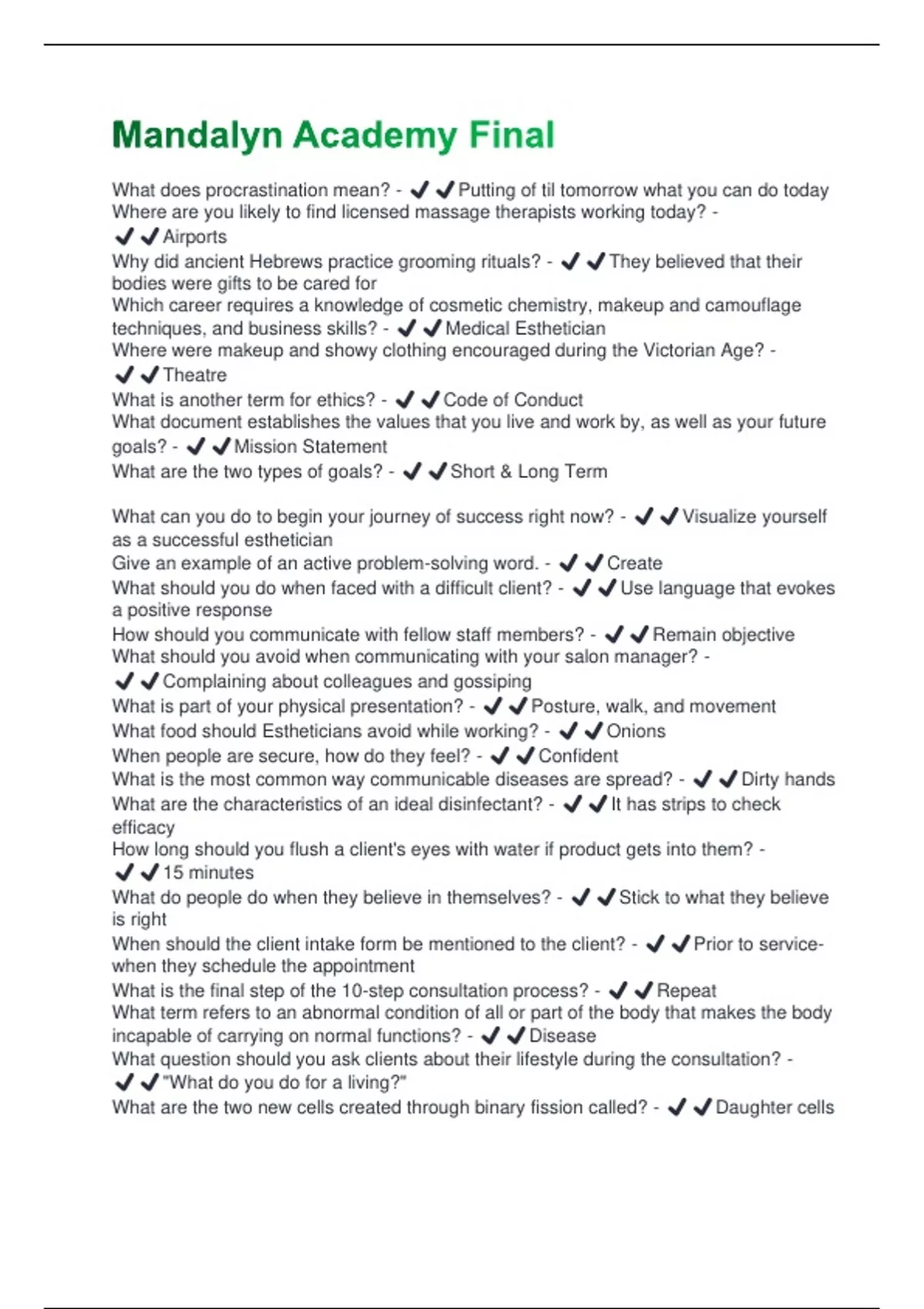 What does procrastination mean? - ️️Putting of til tomorrow what you can do today Where are you likely to find licensed massage therapists working today? - ️️Airports Why did ancient Hebrews practice grooming rituals? - ️️They believed that their bodies were gifts to be cared for Which career requires a knowledge of cosmetic chemistry, makeup and camouflage techniques, and business skills? - ️️Medical Esthetician