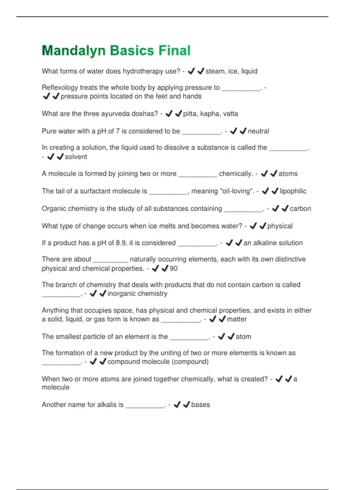 What forms of water does hydrotherapy use? - ️️steam, ice, liquid Reflexology treats the whole body by applying pressure to __________. - ️️pressure points located on the feet and hands What are the three ayurveda doshas? - ️️pitta, kapha, vatta Pure water with a pH of 7 is considered to be __________. - ️️neutral In creating a solution, the liquid used to dissolve a substance is called the __________. - ️️solvent A molecule is formed by joining two or more __________ chemically. - ️️at