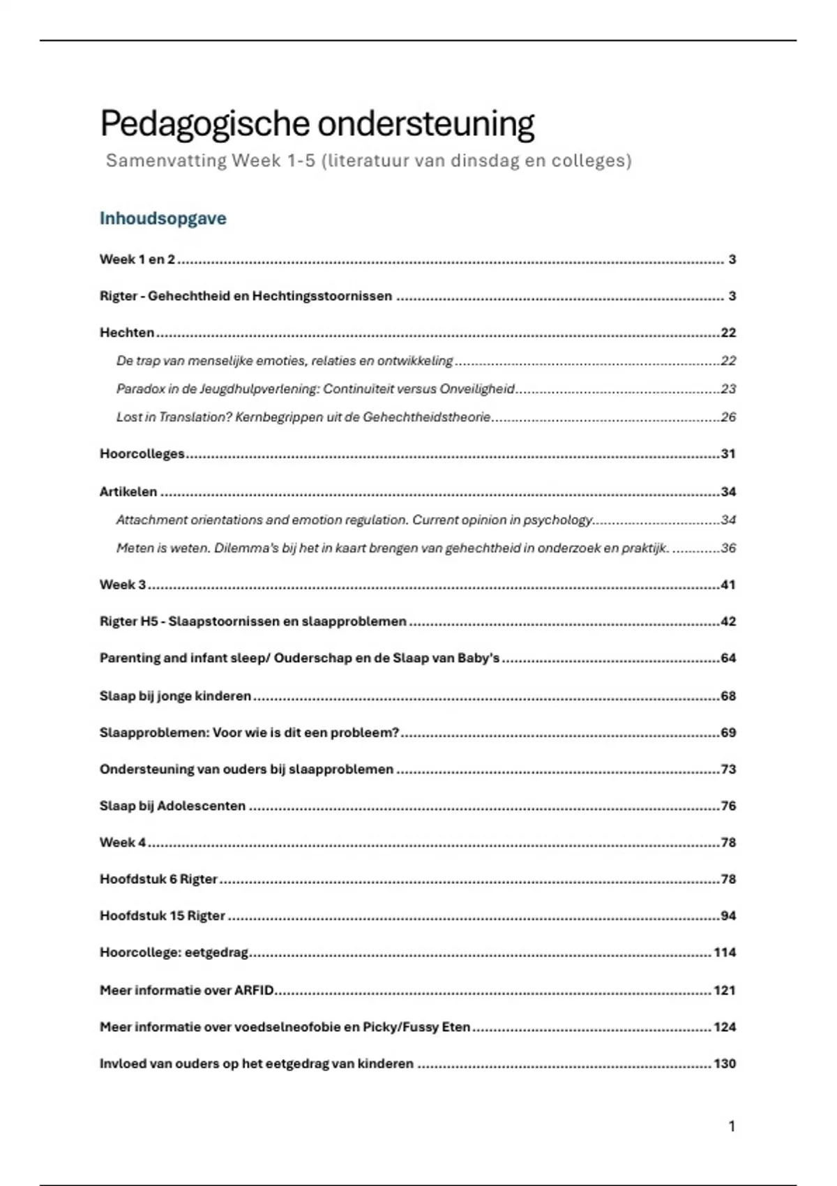 Dit is een samenvatting/alle belangrijke informatie van de dinsdagen van week 1 t/m 5 van het vak Pedagogische ondersteuning. In mijn samenvatting heb ik de info per week gerangschikt. De belangrijkste dingen staan bovenaan, meestal begint het met Rigter, en daarna komen de artikelen van belangrijk naar minder belangrijk. Omdat ik niet zeker weet wat wel of niet belangrijk is, heb ik alles laten staan. Maar, als je echt de kern wilt hebben raad ik aan om van elke week Rigter en het hoorcollege te leren