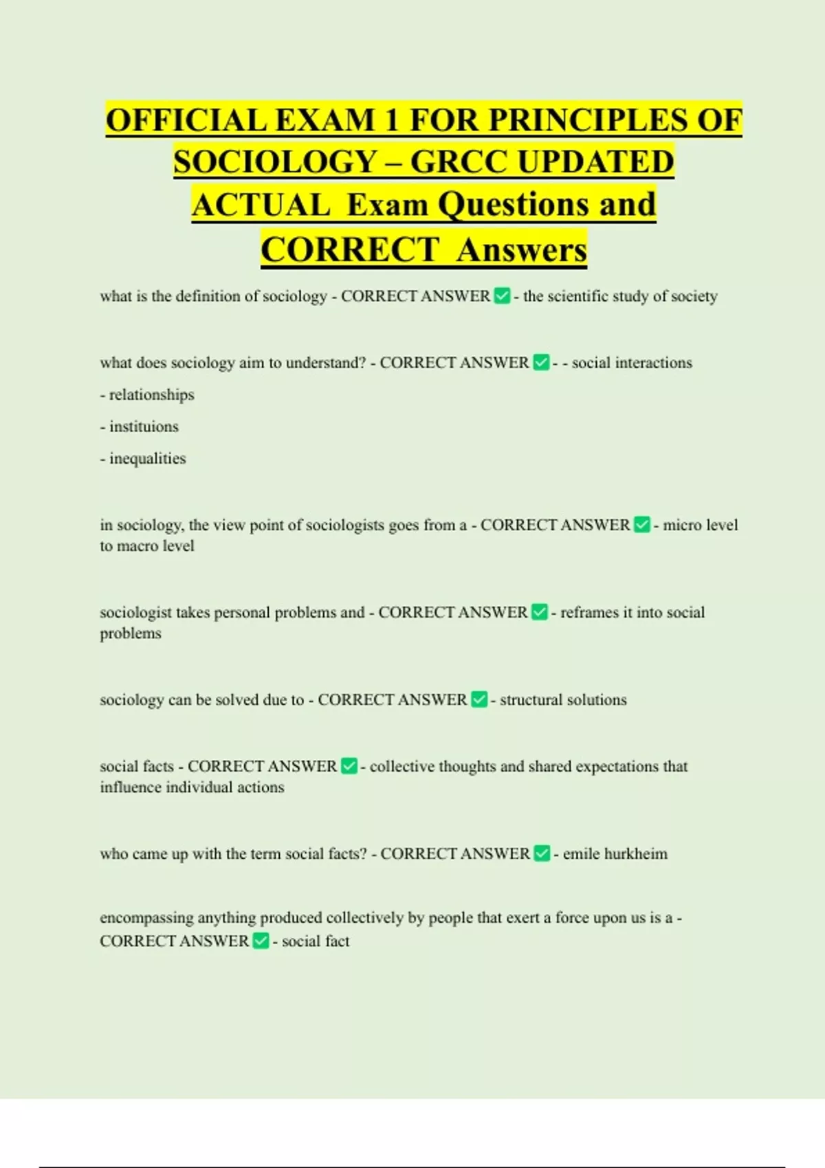 OFFICIAL EXAM 1 FOR PRINCIPLES OF SOCIOLOGY – GRCC UPDATED ACTUAL Exam Questions and CORRECT Answers what is the definition of sociology - CORRECT ANSWER - the scientific study of society what does sociology aim to understand? - CORRECT ANSWER - - social interactions - relationships - instituions - inequalitie