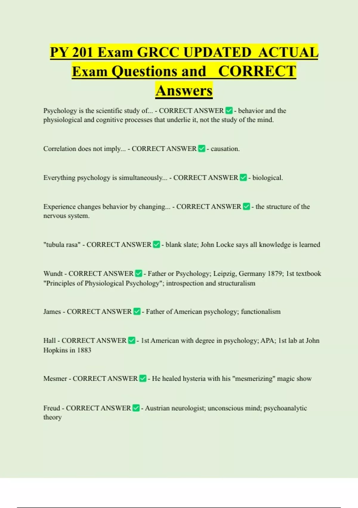 PY 201 Exam GRCC UPDATED ACTUAL Exam Questions and CORRECT Answers Psychology is the scientific study of... - CORRECT ANSWER - behavior and the physiological and cognitive processes that underlie it, not the study of the mind. Correlation does not imply... - CORRECT ANSWER - causation. Everything psychology is simultaneously... - CORRECT ANSWER - biological.