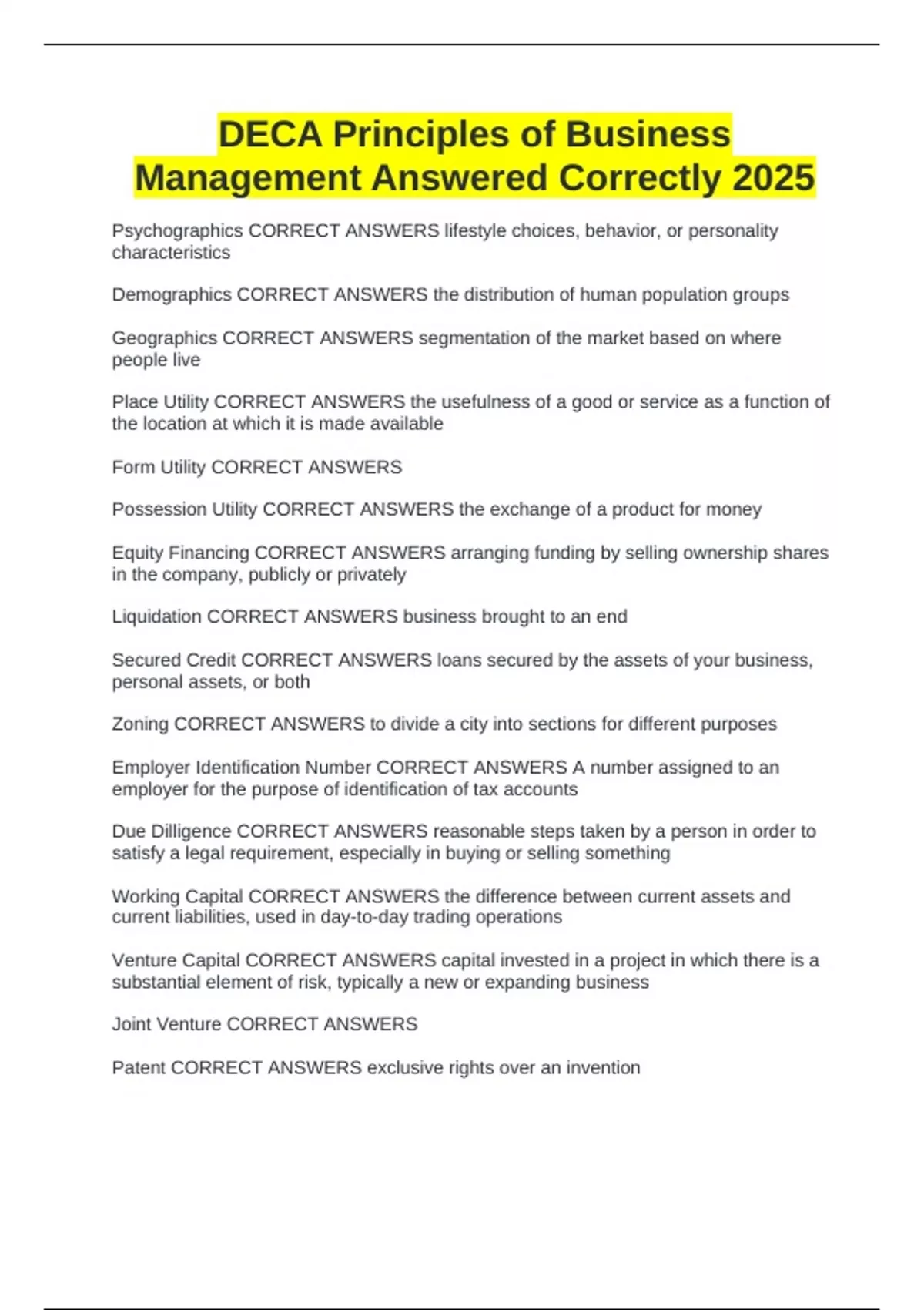 DECA Principles of Business Management Answered Correctly 2025
