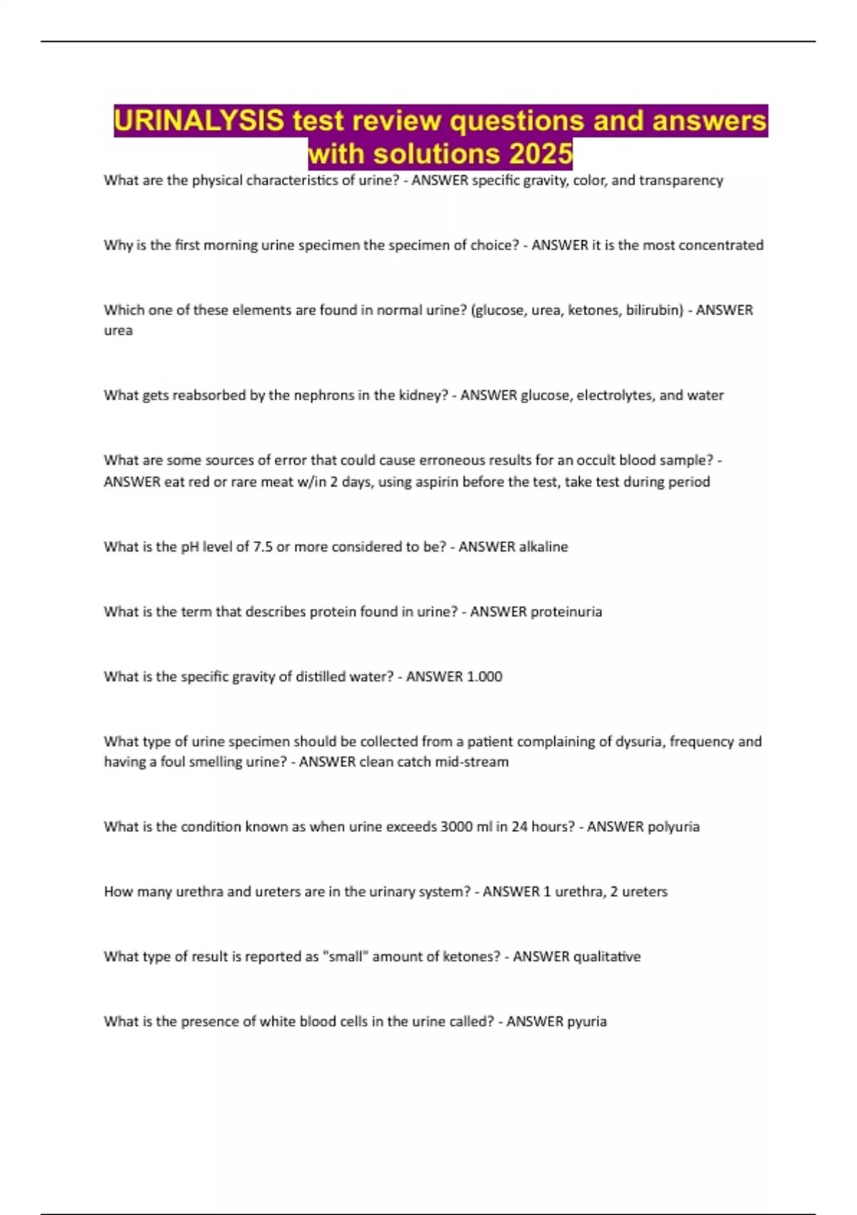 What are the physical characteristics of urine? - ANSWER specific gravity, color, and transparency