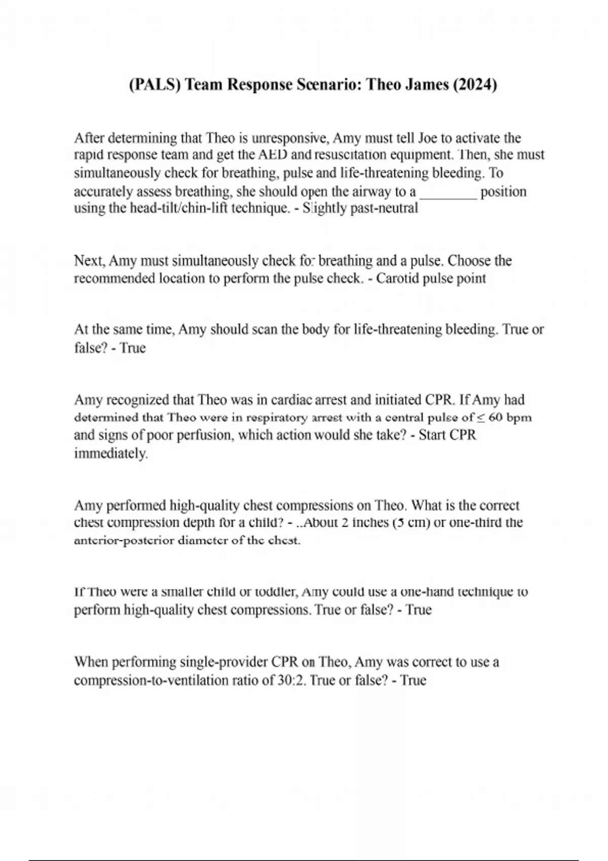 After determining that Theo is unresponsive, Amy must tell Joe to activate the rapid response team and get the AED and resuscitation equipment. Then, she must simultaneously check for breathing, pulse and life-threatening bleeding. To accurately assess breathing, she should open the airway to a ________ position using the head-tilt/chin-lift technique. - Slightly past-neutral Next, Amy must simultaneously check for breathing and a pulse. Choose the recommended location to perform the pulse check. - Carotid pulse point At the same time, Amy should scan the body for life-threatening bleeding. True or false? - True Amy recognized that Theo was in cardiac arrest and initiated CPR. If Amy had determined that Theo were in respiratory arrest with a central pulse of ≤ 60 bpm and signs of poor perfusion, which action would she take? - Start CPR immediately. Amy performed high-quality chest compressions on Theo. What is the correct chest compression depth for a child? - ..About 2 inches (5 cm) or one-third the anterior-posterior diameter of the chest. If Theo were a smaller child or toddler, Amy could use a one-hand technique to perform high-quality chest compressions. True or false? - True When performing single-provider CPR on Theo, Amy was correct to use a compression-to-ventilation ratio of 30:2. True or false? - True