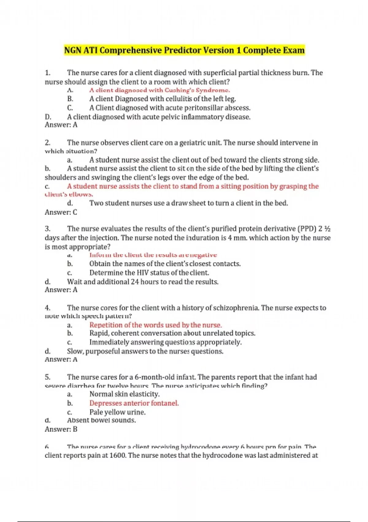 1. The nurse cares for a client diagnosed with superficial partial thickness burn. The nurse should assign the client to a room with which client? A. A client diagnosed with Cushing’s Syndrome. B. A client Diagnosed with cellulitis of the left leg. C. A Client diagnosed with acute peritonsillar abscess. D. A client diagnosed with acute pelvic inflammatory disease. Answer: A 2. The nurse observes client care on a geriatric unit. The nurse should intervene in which situation? a. A student nurse assist the client out of bed toward the clients strong side. b. A student nurse assist the client to sit on the side of the bed by lifting the client’s shoulders and swinging the client’s legs over the edge of the bed. c. A student nurse assists the client to stand from a sitting position by grasping the client’s elbows. d. Two student nurses use a draw sheet to turn a client in the bed. Answer: C 3. The nurse evaluates the results of the client’s purified protein derivative (PPD) 2 ½ days after the injection. The nurse noted the induration is 4 mm. which action by the nurse is most appropriate? a. Inform the client the results are negative b. Obtain the names of the client’s closest contacts. c. Determine the HIV status of the client. d. Wait and additional 24 hours to read the results. Answer: A 4. The nurse cores for the client with a history of schizophrenia. The nurse expects to note which speech pattern? a. Repetition of the words used by the nurse. b. Rapid, coherent conversation about unrelated topics. c. Immediately answering questions appropriately. d. Slow, purposeful answers to the nurses questions. Answer: A 5. The nurse cares for a 6-month-old infant. The parents report that the infant had severe diarrhea for twelve hours. The nurse anticipates which finding? a. Normal skin elasticity. b. Depresses anterior fontanel. c. Pale yellow urine. d. Absent bowel sounds. Answer: B 6. The nurse cares for a client receiving hydrocodone every 6 hours prn for pain. The client reports pain at 1600. The nurse notes that the hydrocodone was last administered at 1200, and the nurse proceeds to administer hydromorphone at 1615. After discovering the error, how should the nurse record the occurrence? a. “Wrong pain tablet given early. Client will be monitored closely. Asleep now.” b. “Hydromorphone given instead of hydrocodone. Nursing supervisor aware of error.” c. Hydrocodone tablet ordered every 6 hours; pain medication given after 4 hours. Health care provider notified.” d. “Hydromorphone given at 1615; health care provider notified. B/P 122/80, RR 16.” Answer: D 7. The male client asks the nurse, “Why am I experiencing erectile dysfunction (ED)?” The nurse reviews the client’s medications. The nurse recognizes that which classification increases the risk for ED? a. Non-steroidal anti-inflammatory drugs. b. Antihypertensive medications. c. Anticoagulant medications. d. Histamine H2 inhibitors. Answer: B 8. The nurse in the hospital cafeteria overhears two nursing assistive personnel (NAP) discuss the client’s condition. What is the PRIORITY action for the nurse to take? a. Change the topic of the conversation. b. Report the employees to their nurse manager. c. Inform the employees about patient confidentiality and the client’s right to privacy. d. Meet with the employees at the end of the shift and tell them not to discuss clients in a public place. Answer: C 9. The nurse cares for a client diagnosed with dehydration. The plan of care indicates the client is to drink two ounces of fluid every hour. The nurse determines the goal is met if which is recorded on the intake and output (I&O) sheet for an eight-hour shift? a. 360 ml b. 160 ml c. 480 ml d. 240 ml 1 oz=30 ml; 60 oz*8= 480 ml Answer: C 10. The nurse and LPN/LVN care for clients on a medical-surgical unit. The RN should delegate which activity to the LPN/LVN? a. Follow up on the client’s report of chest and back itching two hours after starting a patient controlled analgesia pump. b. Provide instruction for the client receiving the first nicotine patch. c. Inform the health care provider of the client’s history of peptic ulcer disease prior to administration of streptokinase. d. Take the blood pressure and heart rate before administration of enalapril. Answer: D 11. The nurses care for the client diagnosed with tuberculosis. Before discontinuing airborne precautions, the nurse must confirm which? a. The tuberculin skin test is negative b. No acid-fast bacteria are in the sputum. c. The client has received anti-tuberculin medication for three days. d. The client’s temperature has returned to normal. Answer: B 12. The nurse cares for the client at 28 weeks gestation diagnosed with a complete placenta previa. The nurse determines discharge teaching is effective if the client makes which statement to her husband? a. I can go back to work tomorrow on a part-time basis b. I’m sorry to tell you we can’t have sexual relations c. I will still be able to have a vaginal birth d. I have to come back in 48 hours for a vaginal exam Answer: B 13. The nurse prepares the client diagnosed with myxedema for discharge. Which action should the nurse teach related to body temperature? a. “Alternate acetaminophen with ibuprophen every four hours for fever” b. “Take your temperature and record the results three times a day.” c. “Put on multiple layers of clothes until you fell comfortably warm.” d. “Use a heating pad during the day and electric blanket at night.” Answer: C 14. The nurse cares for clients in the labor and delivery unit. The nurse anticipates which client is a candidate for induction of labor? a. The client with the fetal face as the presenting part. b. The client diagnosed with preeclampsia. c. The client diagnosed with active herpes infection. d. The client experiencing late decelerations. Answer: B 15. The nurse cares for the client diagnosed with HIV. The nurse determines which goal is M