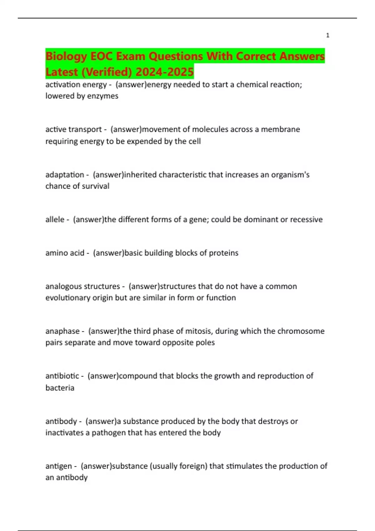 Biology EOC Exam Questions With Correct Answers