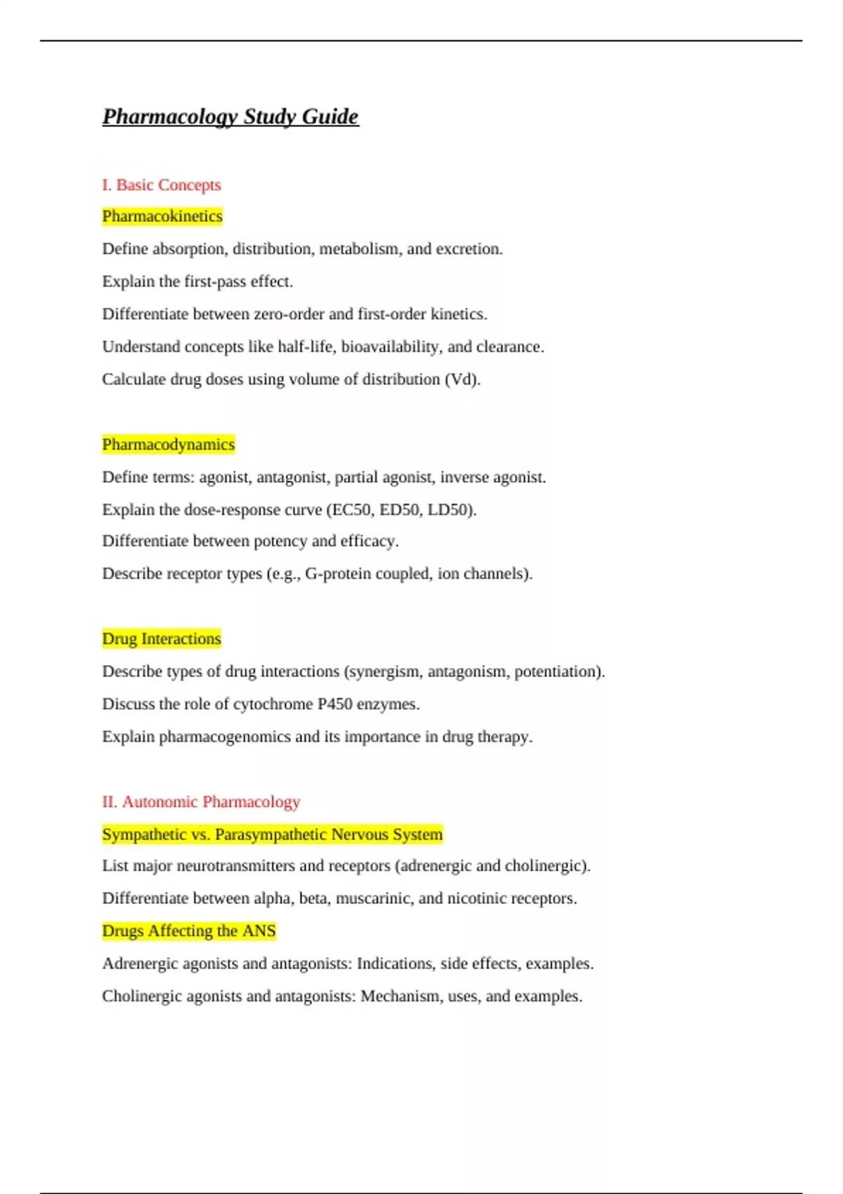 I. Basic Concepts Pharmacokinetics Define absorption, distribution, metabolism, and excretion. Explain the first-pass effect. Differentiate between zero-order and first-order kinetics. Understand concepts like half-life, bioavailability, and clearance. Calculate drug doses using volume of distribution (Vd). Pharmacodynamics Define terms: agonist, antagonist, partial agonist, inverse agonist. Explain the dose-response curve (EC50, ED50, LD50). Differentiate between potency and efficacy. Describe receptor types (e.g., G-protein coupled, ion channels).