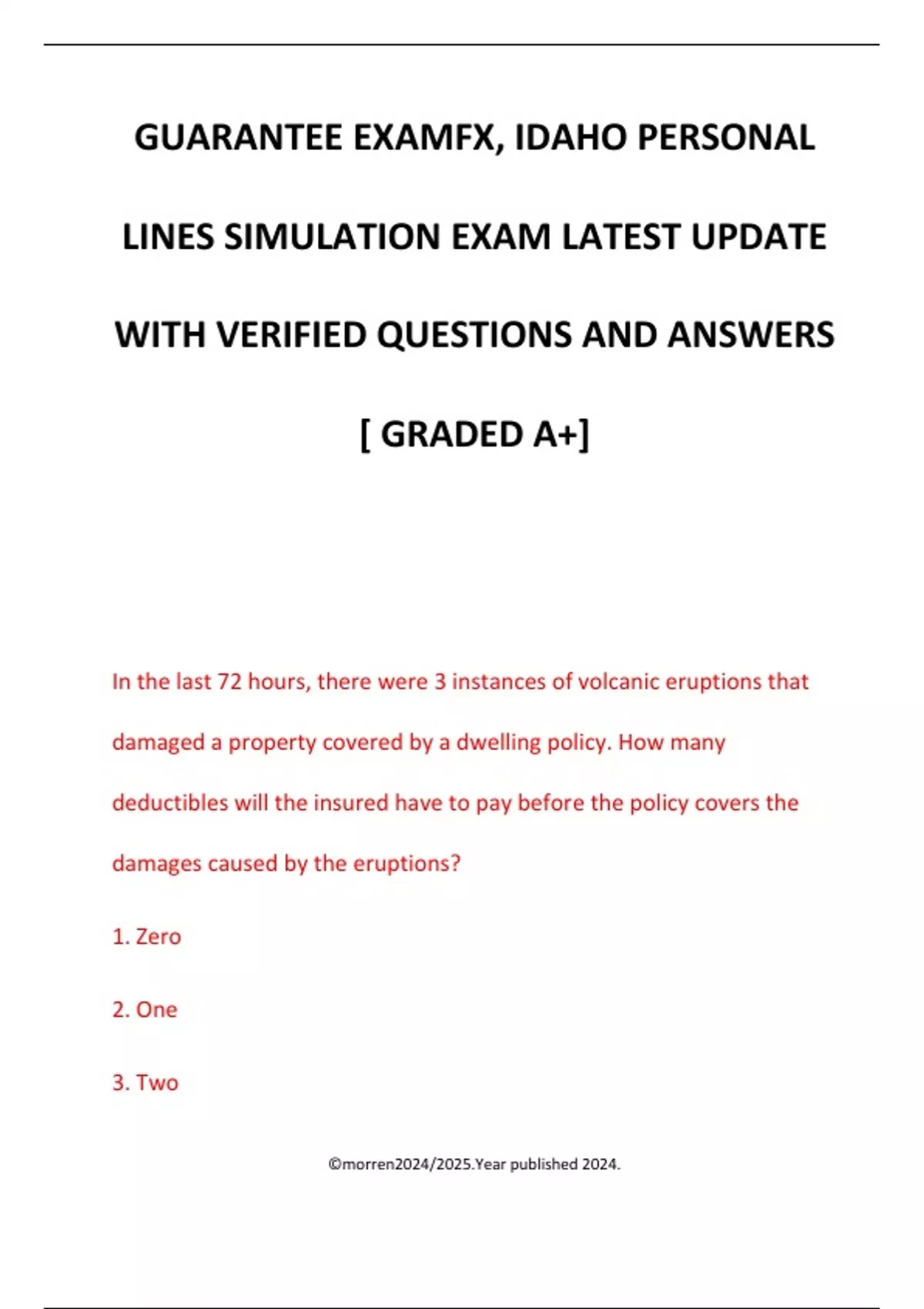GUARANTEE EXAMFX, IDAHO PERSONAL LINES SIMULATION EXAM LATEST UPDATE WITH VERIFIED QUESTIONS AND ANSWERS [ GRADED A+]