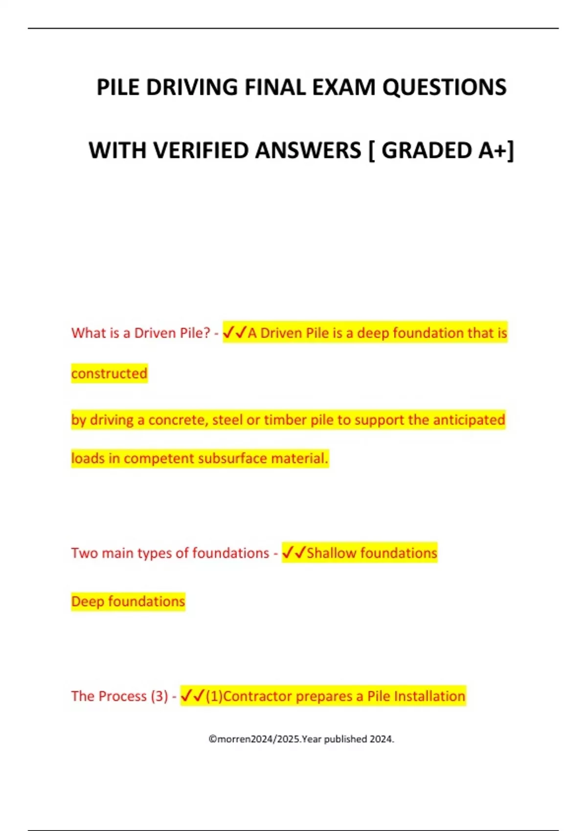 PILE DRIVING FINAL EXAM QUESTIONS WITH VERIFIED ANSWERS [ GRADED A+] What is a Driven Pile? - A Driven Pile is a deep foundation that is constructed by driving a concrete, steel or timber pile to support the anticipated loads in competent subsurface material. Two main types of foundations - Shallow foundations Deep foundations The Process (3) - (1)Contractor prepares a Pile Installation ©morren2024/2025.Year published 2024. Plan (PIP) (2)Test Pile program is performed (3)Driving of Production Piles How the load is transferred?(2) - (1)End Bearing (2)Friction Pile Driving System Components 2-3 - • Pile Types • Hammers & Cushions • Cranes & Leads • Templates • Soil ©morren2024/2025.Year published 2024.