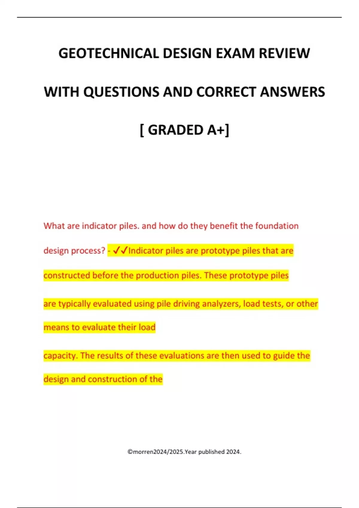 GEOTECHNICAL DESIGN EXAM REVIEW WITH QUESTIONS AND CORRECT ANSWERS [ GRADED A+] What are indicator piles. and how do they benefit the foundation design process? - Indicator piles are prototype piles that are constructed before the production piles. These prototype piles are typically evaluated using pile driving analyzers, load tests, or other means to evaluate their load capacity. The results of these evaluations are then used to guide the design and construction of the ©morren2024/2025.Year published 2024. production piles. In many cases, the indicator piles also are used to support the structure. Many engineers believe the only disadvantage to over designing pile foundations is the additional cost of the pile materials. However, there is another important consequence of over design which can significantly affect construction cost and may even make the foundation impossible to build. What is this consequence and how can it be avoided? - In addition to increasing materials costs, over designed piles are more difficult to install, thus increasing labor and equipment costs. In some cases, the additional labor and equipment costs, as well as the associated delays in the construction schedule, can be dis proportionally large compared to the additional ©morren2024/2025.Year published 2024. capacity gained. These unnecessary costs and delays c
