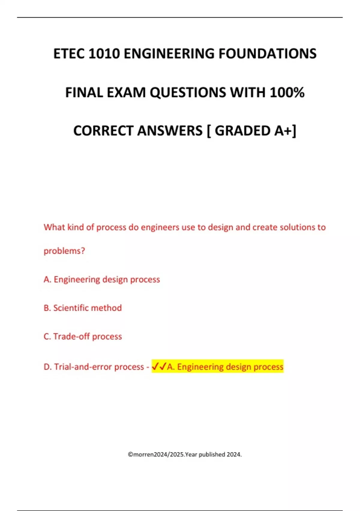 ETEC 1010 ENGINEERING FOUNDATIONS FINAL EXAM QUESTIONS WITH 100% CORRECT ANSWERS [ GRADED A+] What kind of process do engineers use to design and create solutions to problems? A. Engineering design process B. Scientific method C. Trade-off process D. Trial-and-error process - A. Engineering design process ©morren2024/2025.Year published 2024. Which of the following are examples of scientific knowledge sometimes needed in engineering? A. Algebra, calculus, and statistics B. Statics, Ohm's law, and thermodynamics C. The use of computer-aided design software and drawing tools D. The use of gauges, meters, and scales - B. Statics, Ohm's Law, and Thermodynamics Which of the following are examples of engineering disciplines? A. Aerospace engineering, manufacturing engineering, and chemical engineering B. Materials engineering, electrical engineering, and civil engineering C. Mechanical engineering, biotechnical engineering, and computer engineering ©morren2024/2025.Year published 2024.