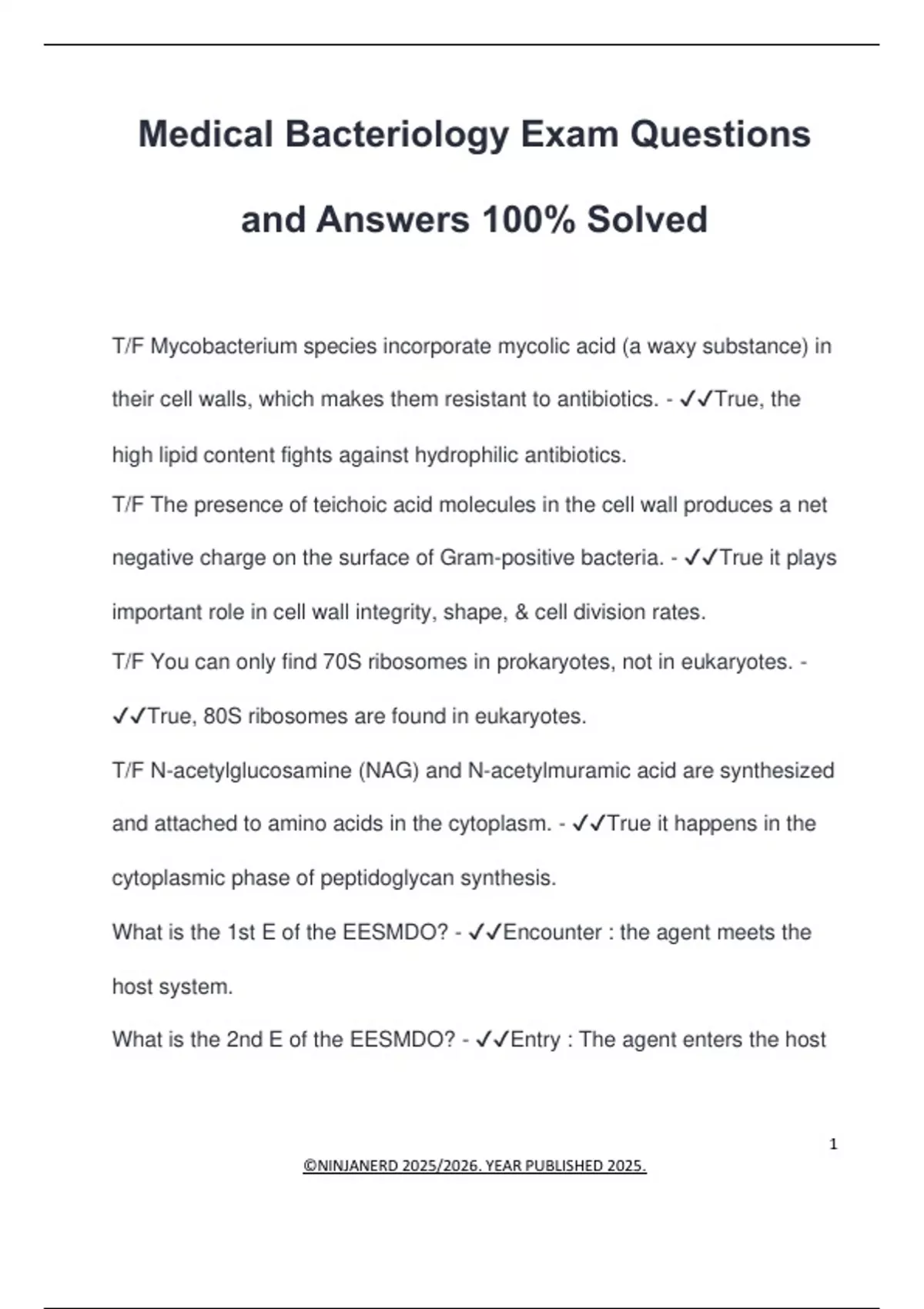 Medical Bacteriology Exam Questions and Answers 100% Solved T/F Mycobacterium species incorporate mycolic acid (a waxy substance) in their cell walls, which makes them resistant to antibiotics. - True, the high lipid content fights against hydrophilic antibiotics. T/F The presence of teichoic acid molecules in the cell wall produces a net negative charge on the surface of Gram-positive bacteria. - True it plays important role in cell wall integrity, shape, & cell division rates. T/F You can only find 70S ribosomes in prokaryotes, not in eukaryotes. - True, 80S ribosomes are found in eukaryotes. T/F N-acetylglucosamine (NAG) and N-acetylmuramic acid are synthesized and attached to amino acids in the cytoplasm. - True it happens in the cytoplasmic phase of peptidoglycan synthesis. What is the 1st E of the EESMDO? - Encounter : the agent meets the host system. What is the 2nd E of the EESMDO? - Entry : The agent enters the h