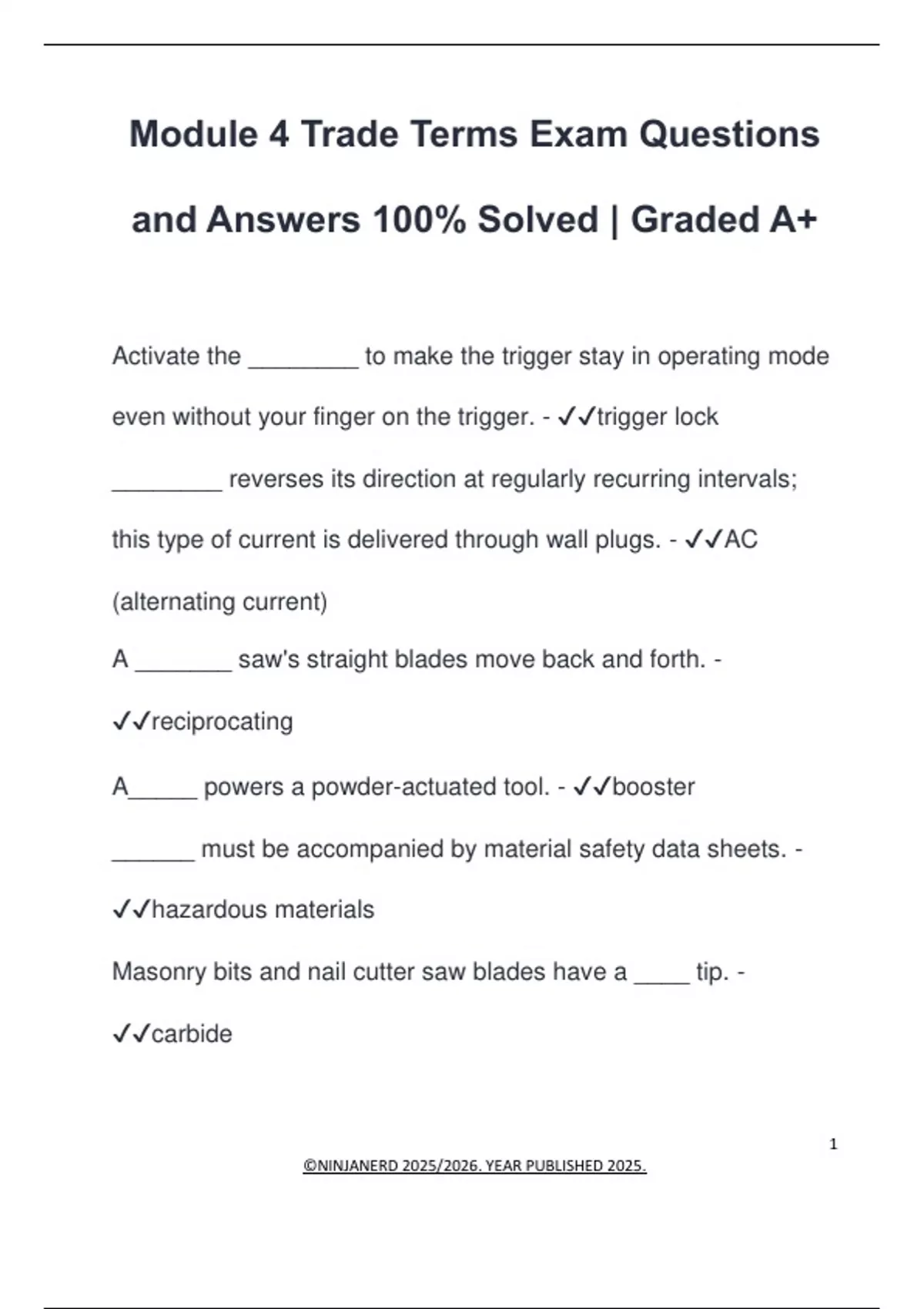 Module 4 Trade Terms Exam Questions and Answers 100% Solved | Graded A+ Activate the ________ to make the trigger stay in operating mode even without your finger on the trigger. - trigger lock ________ reverses its direction at regularly recurring intervals; this type of current is delivered through wall plugs. - AC (alternating current) A _______ saw's straight blades move back and forth. - reciprocating A_____ powers a powder-actuated tool. - booster ______ must be accompanied by material safety data sheets. - hazardous materials Masonry bits and nail cutter saw blades have a ____ tip. - carbide